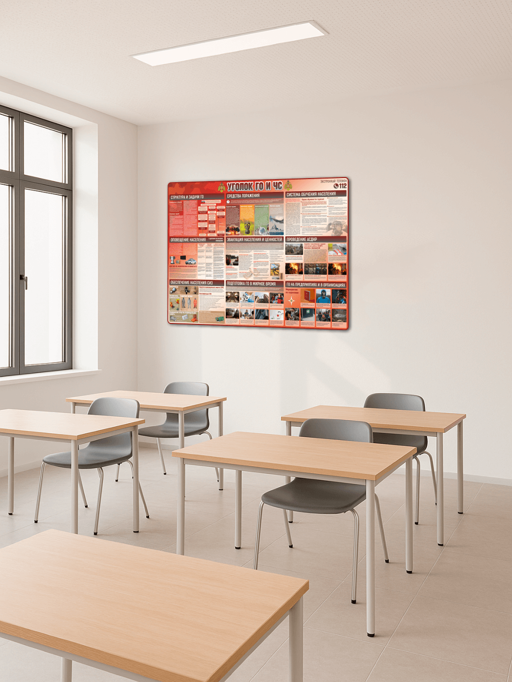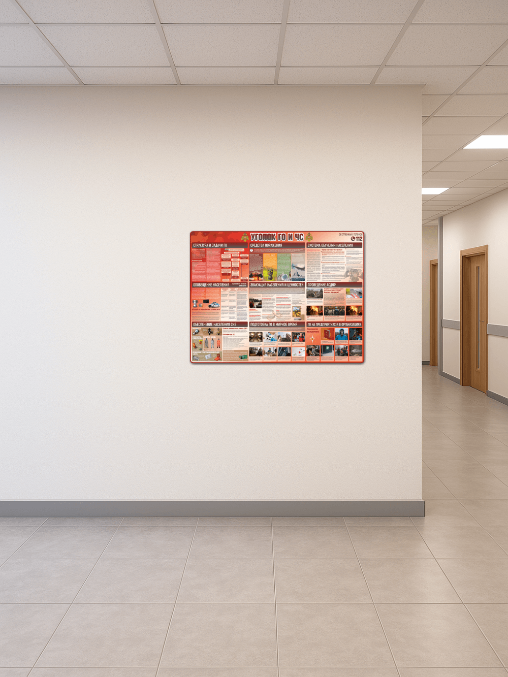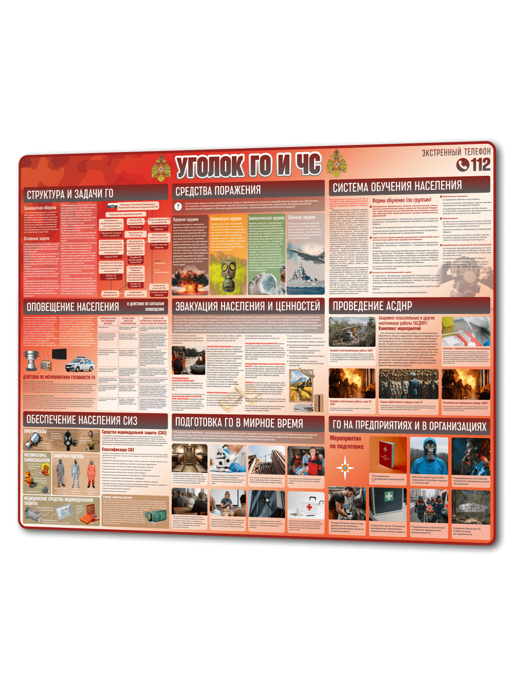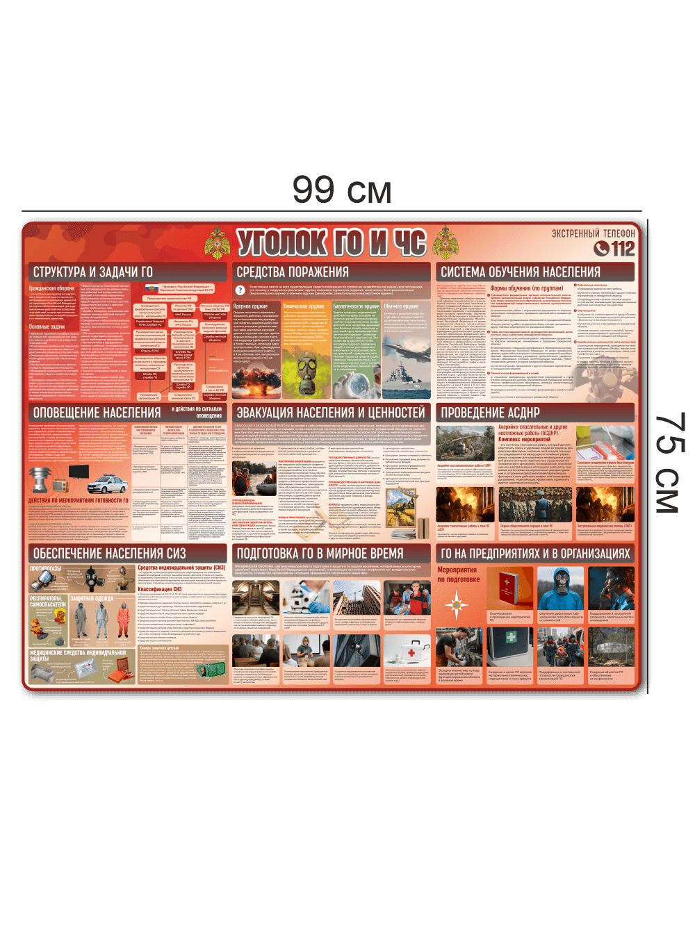 Стенд «Уголок ГО и ЧС» 99×75 см предназначен для оформления информационных зон по гражданской обороне и чрезвычайным ситуациям. Изготовлен из прочного ПВХ 3 мм с качественной УФ-печатью, устойчивой к выцветанию и механическому воздействию. На обороте установлена клейкая монтажная лента, позволяющая закрепить стенд без сверления.