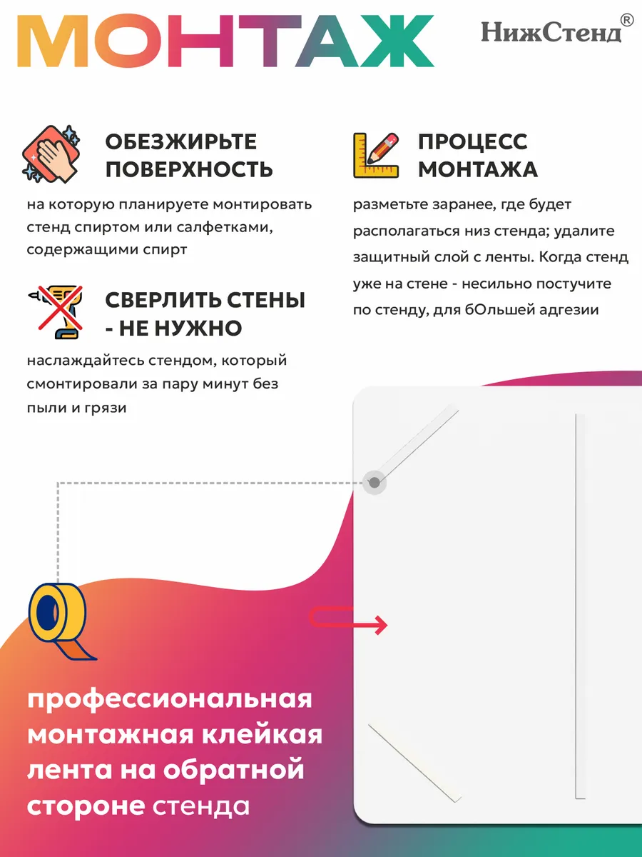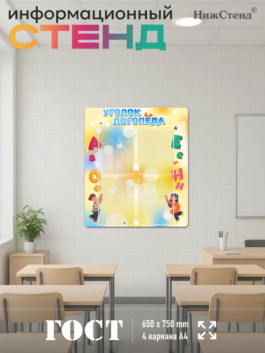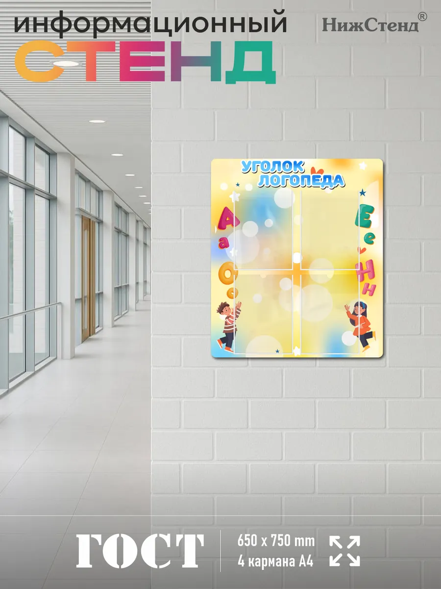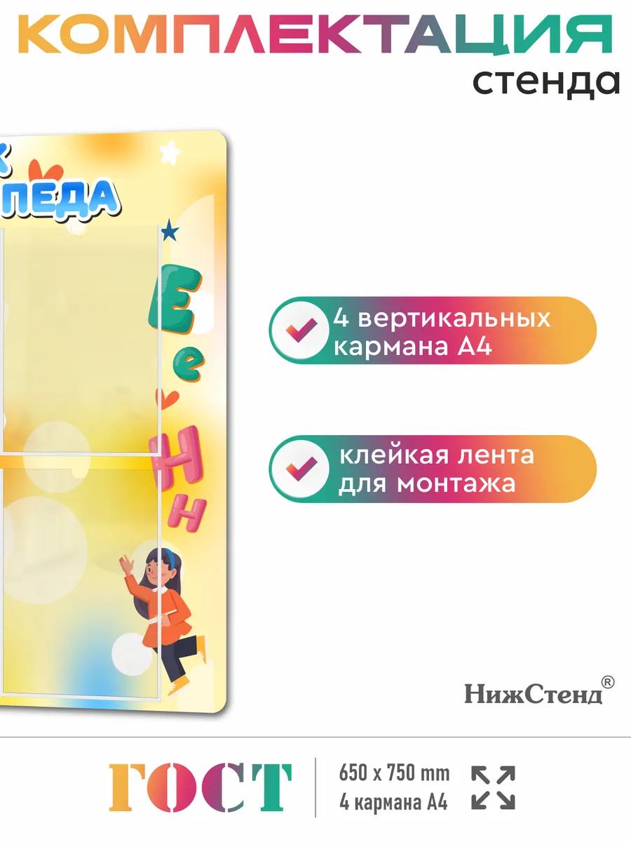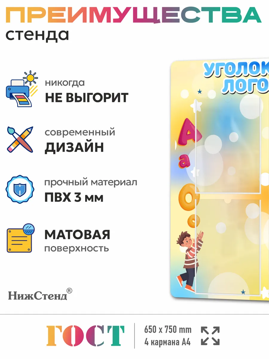 Стенд для детского сада и школы Советы учителя-логопеда изготовлен из ПВХ 3мм с применением технологии прямой УФ печати по пластику, что делает стенд устойчивым к выгоранию и влажности, так же стенд можно протирать от загрязнений влажной тряпкой или салфетками. На обратной стороне стенда – двусторонняя клейкая лента для монтажа стенда на стену без сверления. Размер стенда – 65х75 см. Стенды для детского сада на стену. Стенды для детского сада. Стенды для детей это неотъемлемая часть помещений, в которых проводят время школьники и дошкольники. Детский стенд помогает малышам познавать мир, а школьникам и дошкольникам знакомится с историей и получать необходимые знания. Детские стенды яркие и обязательно привлекут к себе внимание. Стенд предназначен для информационно-справочных материалов для родителей в детском саду, а для малышей — выглядит веселым интересным украшением. Педагогическая пропаганда, развитие ребенка, вести с занятий, приказы, памятки, анкеты и прочие важные темы играют немаловажную роль в поддержании связи между администрацией/воспитателями детского сада и родителями. Стенд обязательно понравится своим ярким дизайном. На стенде имеются 4 вертикальных кармана А4 для размещения в них информации. Такое оформление детского творчества придаст образовательному процессу атмосферу гармонии, веселья и повысит настроение малышей. Все изображения устойчивы к влаге и выгоранию, при необходимости можно мыть. Также изображения не сдираются и не царапаются. Все стенды имеют сертификат ГОСТ и изготовлены из нетоксичных материалов. Наши информационные стенды обязательно должны быть в Вашем интерьере! Если у Вас остались вопросы, задайте нам их и мы Вам обязательно ответим! Будем признательны, если после покупки Вы оставите нам отзыв с фото! Будем рады видеть Вас среди наших покупателей!