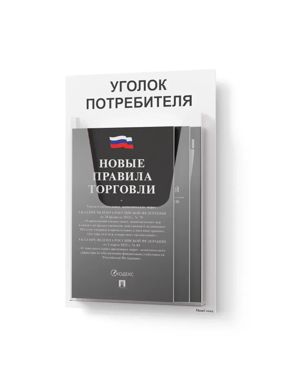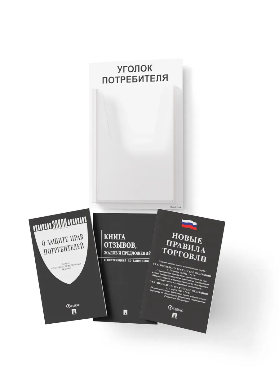 уголок потребителя 2025, мини-уголок покупателя, стенд для книги жалоб, стенд на стену, комплект документов, информационный стенд без сверления, пластиковый стенд с карманом, закон о правах потребителей