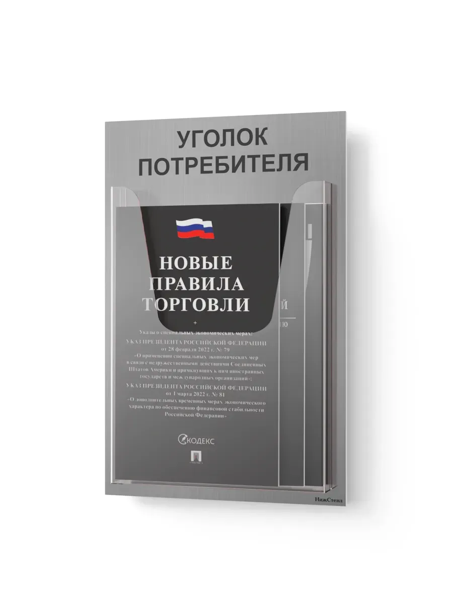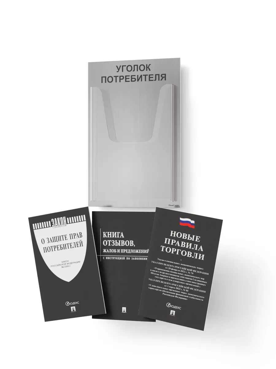 уголок потребителя 2025, мини-уголок покупателя, стенд для книги жалоб, стенд на стену, комплект документов, информационный стенд без сверления, пластиковый стенд с карманом, закон о правах потребителей