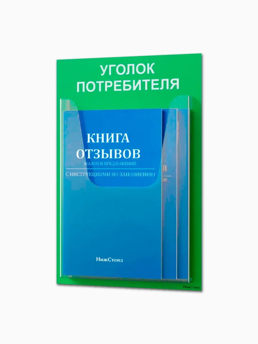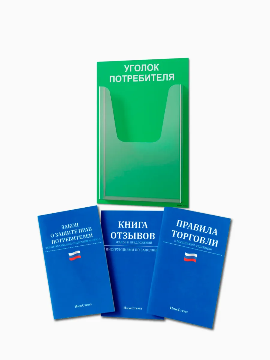 уголок потребителя 2025, мини-уголок покупателя, стенд для книги жалоб, стенд на стену, комплект документов, информационный стенд без сверления, пластиковый стенд с карманом, закон о правах потребителей