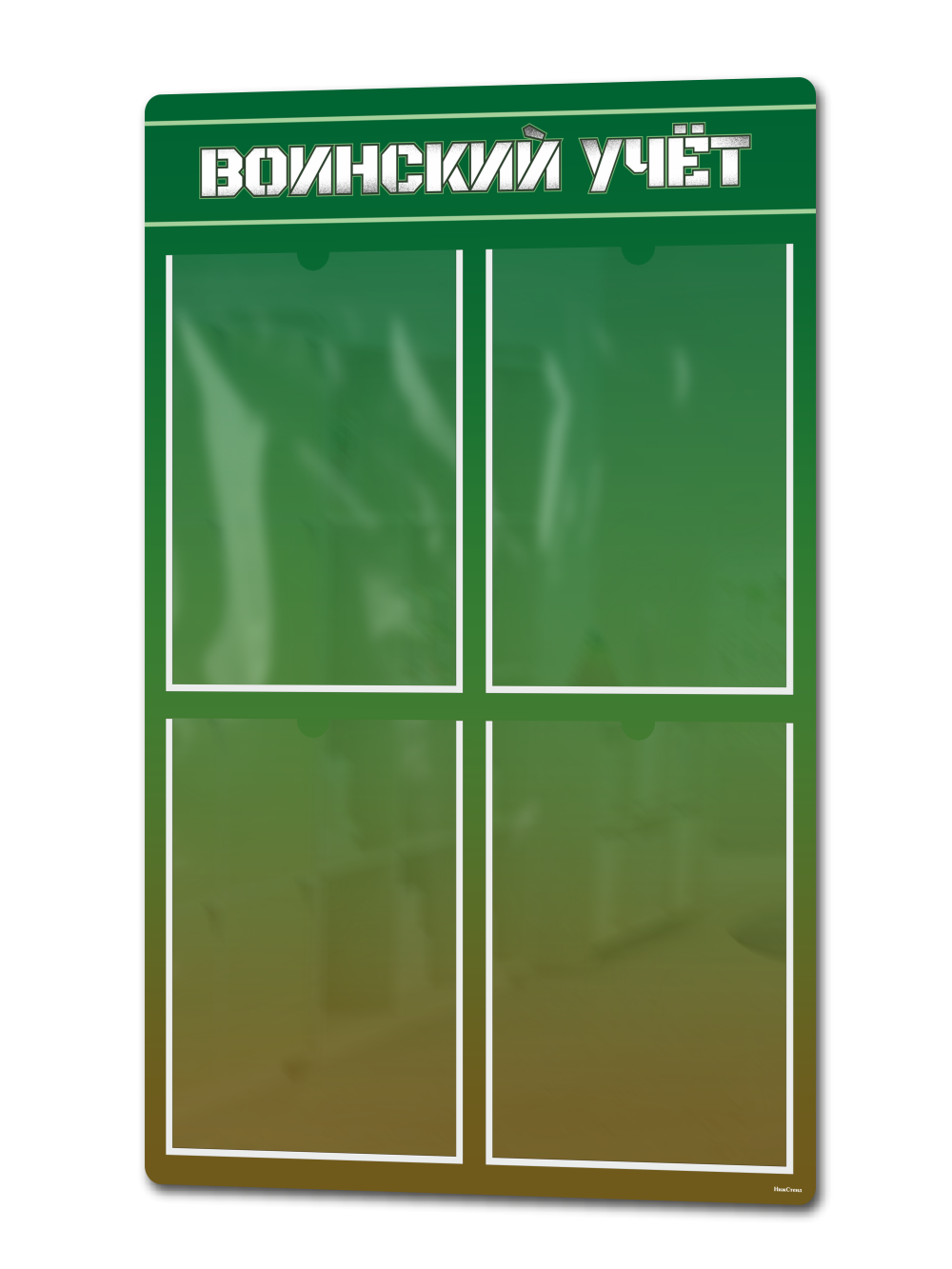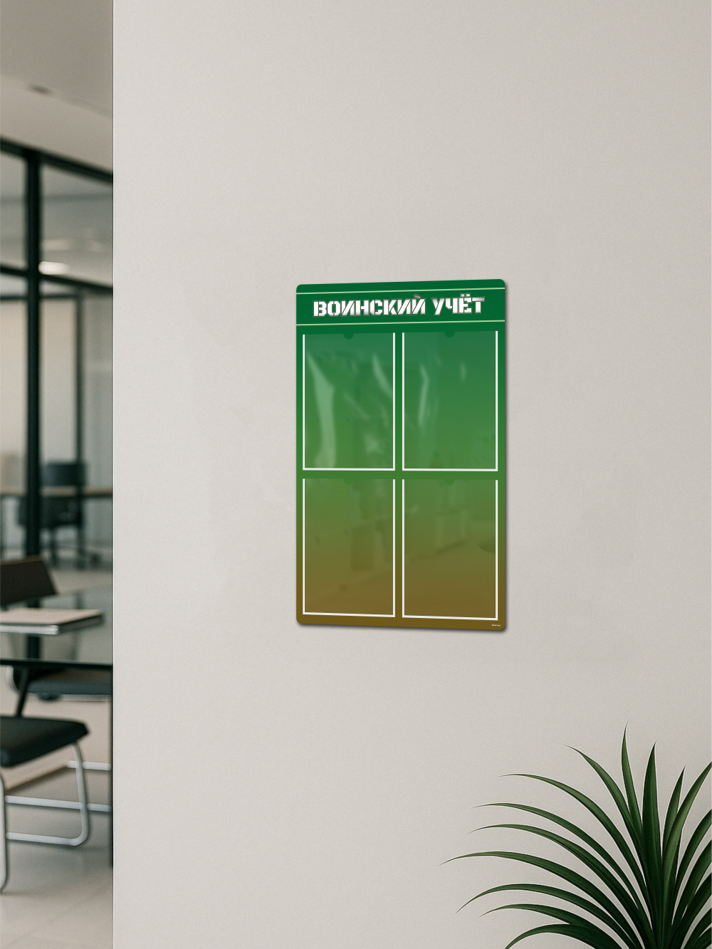 Стенд «Воинский учёт» 50×75 см — это компактное и функциональное информационное решение для размещения обязательных сведений по воинскому учёту в образовательных учреждениях, государственных организациях, предприятиях и офисах. Модель оснащена 4 плоскими прозрачными карманами формата А4, которые позволяют удобно и аккуратно разместить документы, приказы, памятки, инструкции и обновляемые информационные материалы.