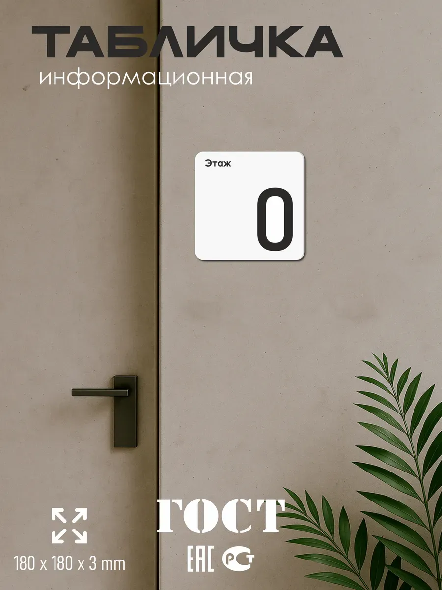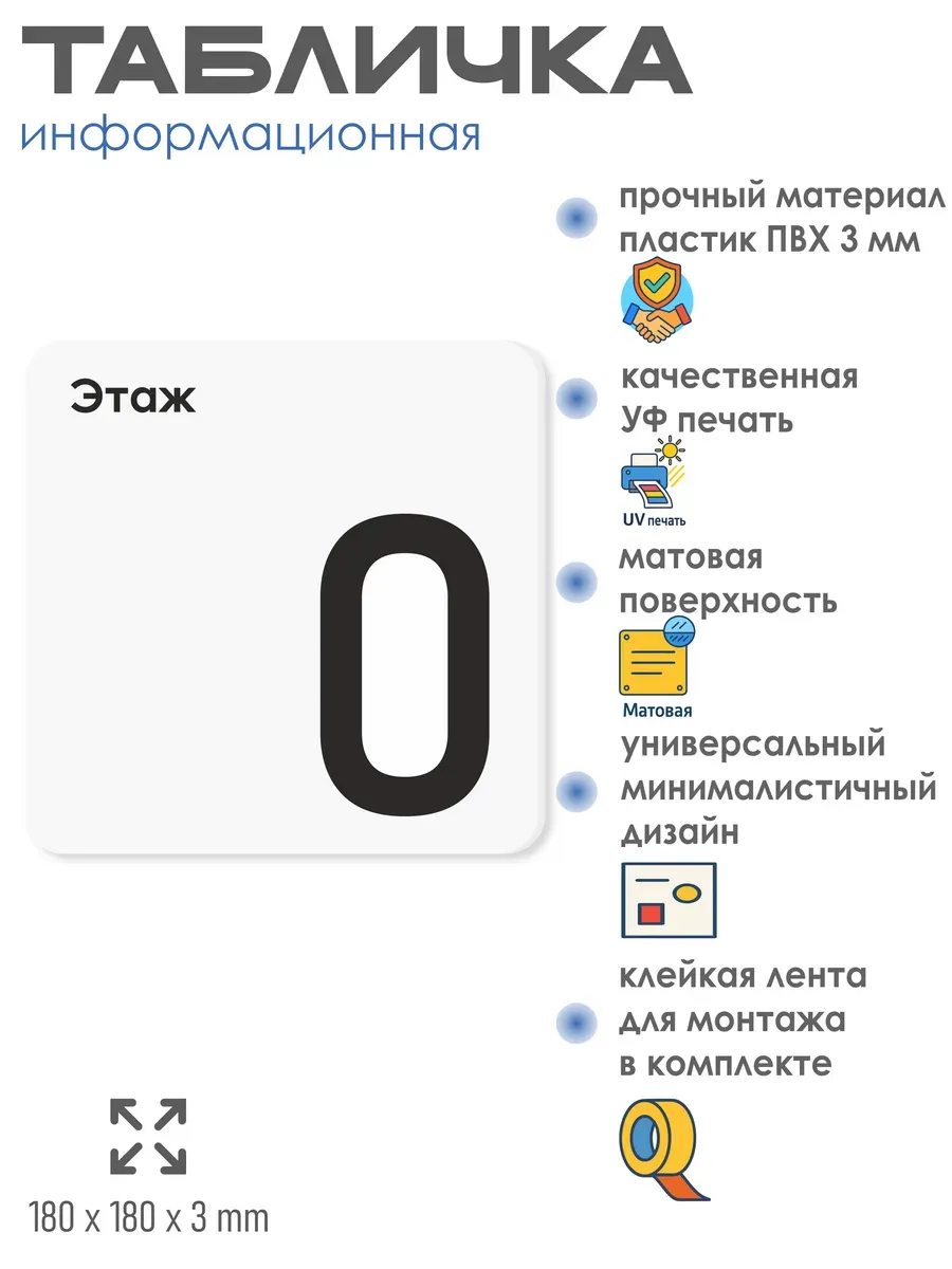 Табличка нулевой 0 этаж с двусторонней клейкой лентой для монтажа в комплекте директор интерьерная из ПВХ 3мм размером 18х18 см – это стильный и универсальный декоративный элемент, который поможет создать особую атмосферу в вашем интерьере. Изготовлена из высококачественного ПВХ, она обладает прочностью и долговечностью, что делает ее идеальным выбором для использования в различных помещениях. На табличке имеется возможность нанесения различных надписей, все представлены в ассортименте. Благодаря белому цвету и минималистичному дизайну, она легко сочетается с любым интерьером и стилем оформления. Эта табличка является универсальным решением для множества задач. Вы можете использовать ее для обозначения названий комнат, оповещения и предупреждения граждан. Она идеально подходит для дома, офиса, ресторана, гостиницы, в школу, в гос. учреждения, в клинику, в больницу, в фитнес клуб. В магазине представлены таблички с надписями: мужской туалет, женский туалет, офис, склад, место для курения, для персонала, курение запрещено, чистые бахилы, грязные бахилы, надевайте бахилы, женская раздевалка, мужская раздевалка, банкомат, бассейн, администрация, офис, буфет, камера хранения, прачечная, выключайте звуки телефона, туалет, комната матери и ребенка, вход, выход, генеральный директор, касса, информация, комната ожидания, не бросайте в унитаз туалетную бумагу и предметы гигиены, камера хранения, за оставленные вещи администрация ответственности не несет, ведется видеонаблюдение, выключайте звуки мобильного телефона
