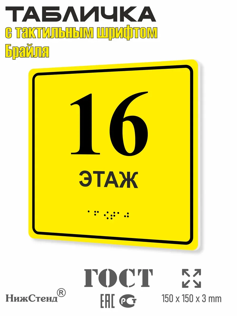 Тактильная табличка “16 этаж” со шрифтом Брайля (150×150 мм)