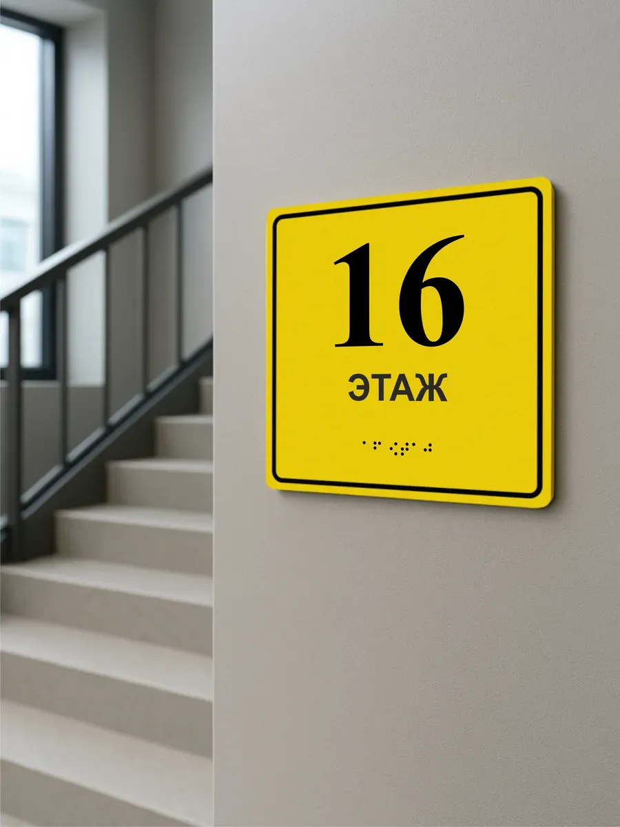 Тактильная табличка с надписью «16 этаж» и рельефным шрифтом Брайля — это обязательный элемент адаптированной среды для людей с нарушениями зрения.