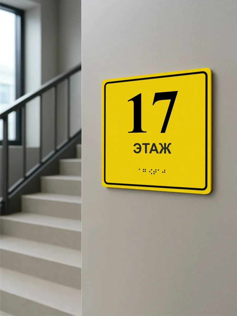Тактильная табличка с надписью «17 этаж» и рельефным шрифтом Брайля — это обязательный элемент адаптированной среды для людей с нарушениями зрения.