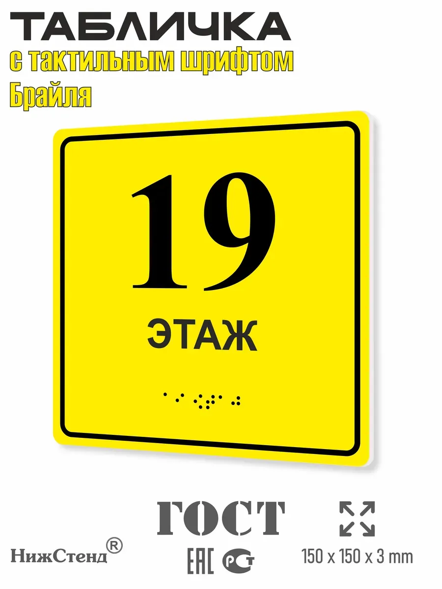 Тактильная табличка “19 этаж” со шрифтом Брайля (150×150 мм)
