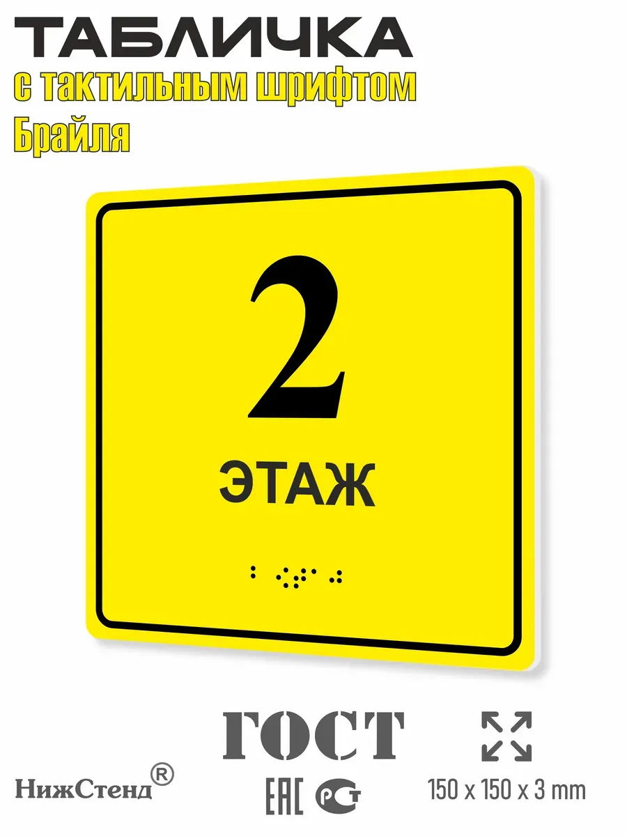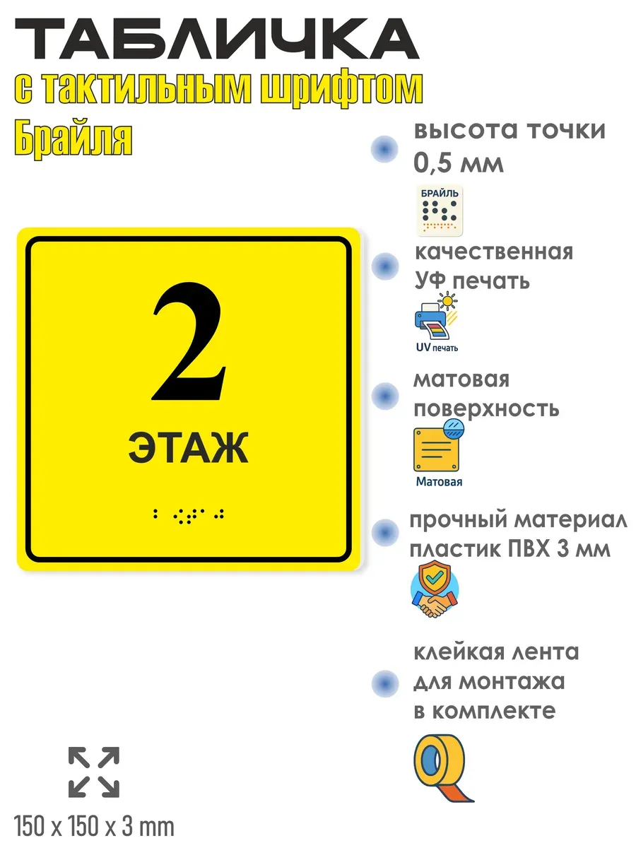 Тактильная табличка “2 этаж” со шрифтом Брайля (150×150 мм)