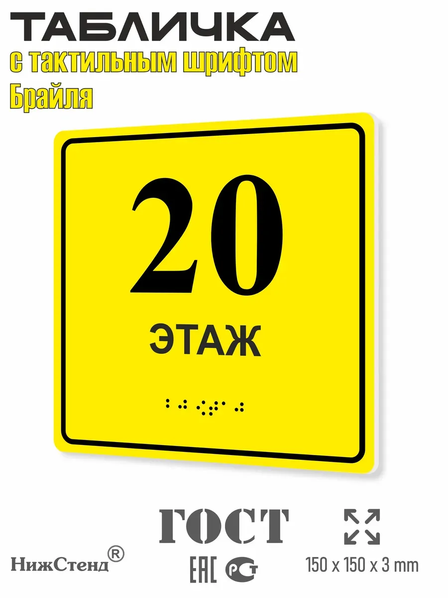 Тактильная табличка “20 этаж” со шрифтом Брайля (150×150 мм)
