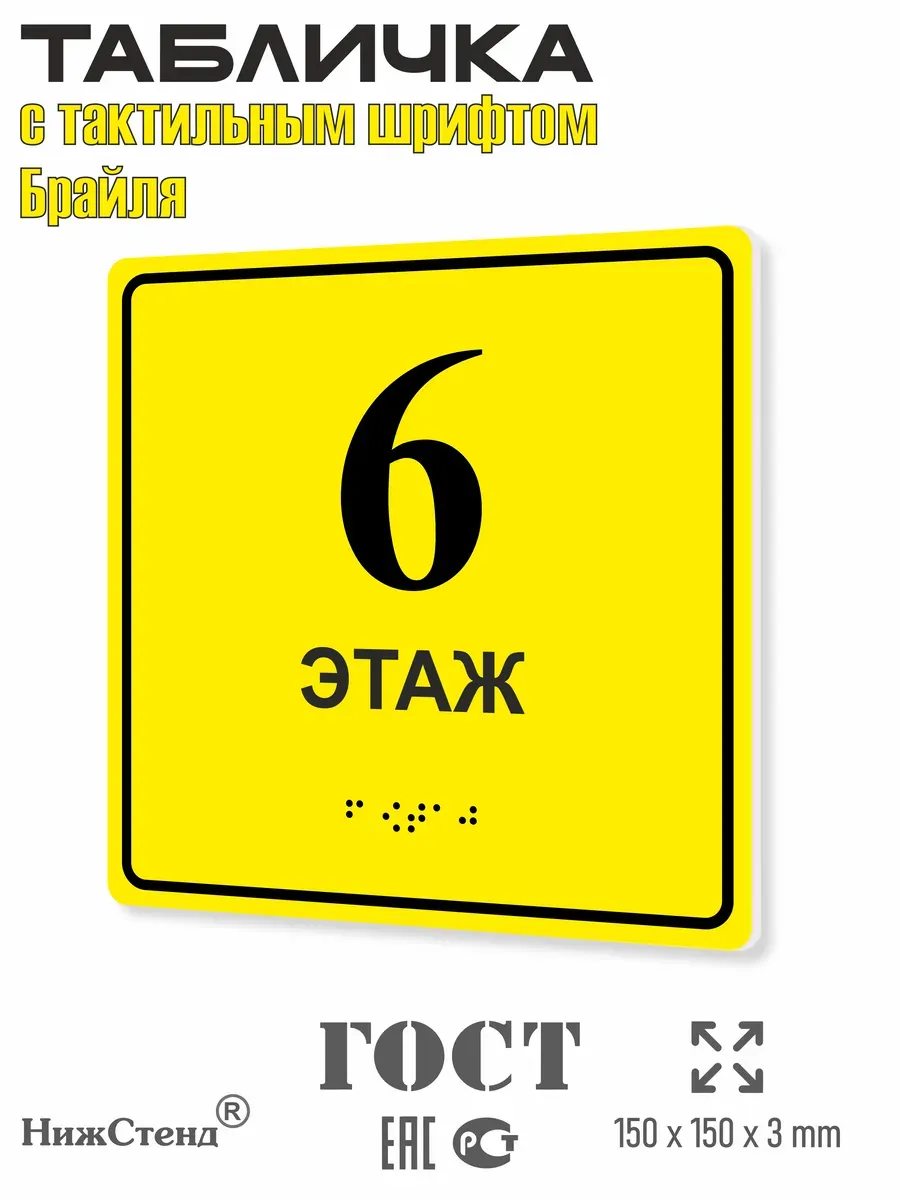 Тактильная табличка “6 этаж” со шрифтом Брайля (150×150 мм)