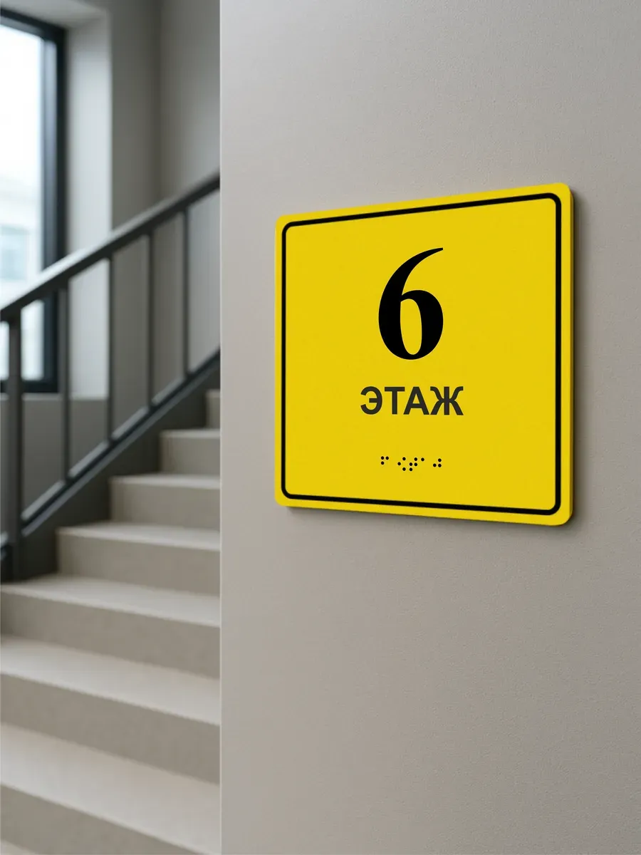 Тактильная табличка с надписью «6 этаж» и рельефным шрифтом Брайля — это обязательный элемент адаптированной среды для людей с нарушениями зрения.
