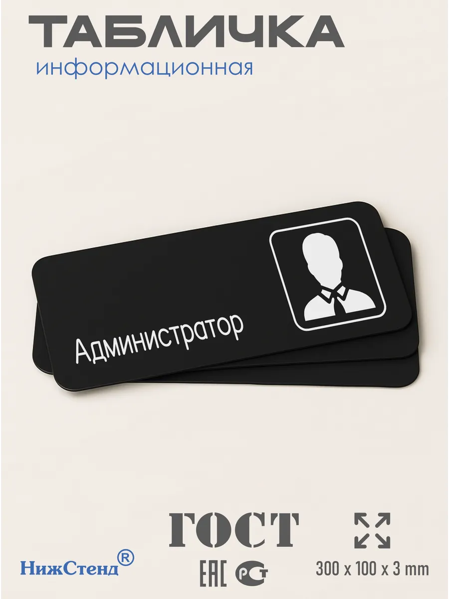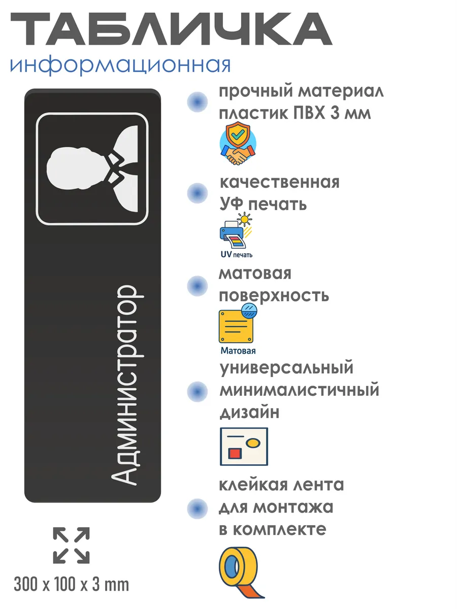 Табличка Администратор интерьерная из черного ПВХ 3мм размером 30х10 см – это стильный и универсальный декоративный элемент, который поможет создать особую атмосферу в вашем интерьере. Изготовлена из высококачественного черного ПВХ, она обладает прочностью и долговечностью, что делает ее идеальным выбором для использования в различных помещениях. На табличке имеется возможность нанесения различных надписей, все представлены в ассортименте. Благодаря черному цвету и минималистичному дизайну, она легко сочетается с любым интерьером и стилем оформления. Эта табличка является универсальным решением для множества задач. Вы можете использовать ее для обозначения названий комнат, оповещения и предупреждения граждан. Она идеально подходит для дома, офиса, ресторана, гостиницы, в школу, в гос. учреждения, в клинику, в больницу, в фитнес клуб. В магазине представлены таблички с надписями: мужской туалет, женский туалет, офис, склад, место для курения, для персонала, курение запрещено, чистые бахилы, грязные бахилы, надевайте бахилы, женская раздевалка, мужская раздевалка, банкомат, бассейн, администрация, офис, буфет, камера хранения, прачечная, выключайте звуки телефона, туалет, комната матери и ребенка, вход, выход, генеральный директор, касса, информация, комната ожидания, не бросайте в унитаз туалетную бумагу и предметы гигиены, камера хранения, за оставленные вещи администрация ответственности не несет, ведется видеонаблюдение, выключайте звуки мобильного телефона
