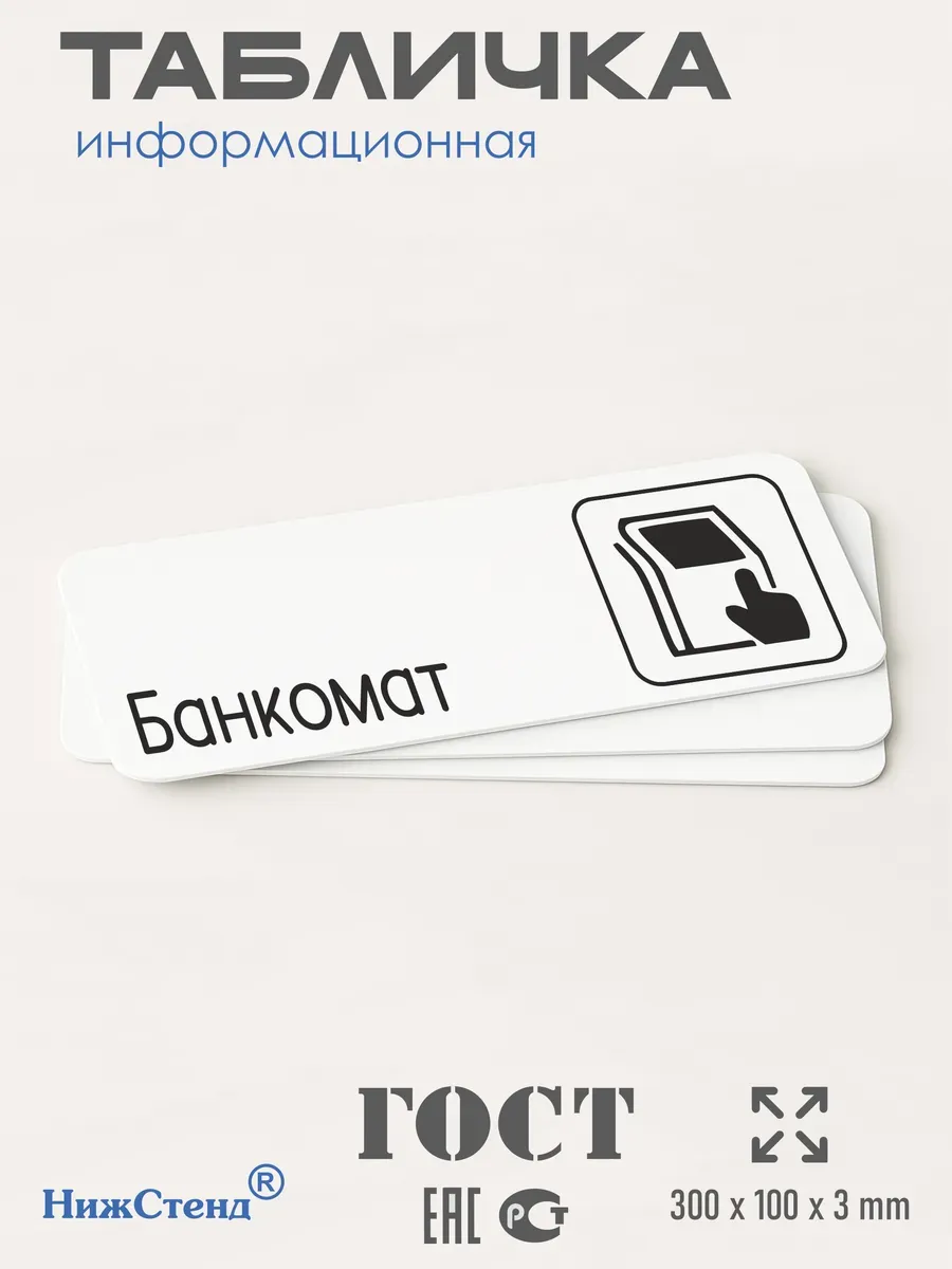 Табличка Банкомат с двусторонней клейкой лентой для монтажа в комплекте интерьерная из ПВХ 3мм размером 30х10 см – это стильный и универсальный декоративный элемент, который поможет создать особую атмосферу в вашем интерьере. Изготовлена из высококачественного ПВХ, она обладает прочностью и долговечностью, что делает ее идеальным выбором для использования в различных помещениях. На табличке имеется возможность нанесения различных надписей, все представлены в ассортименте. Благодаря белому цвету и минималистичному дизайну, она легко сочетается с любым интерьером и стилем оформления. Эта табличка является универсальным решением для множества задач. Вы можете использовать ее для обозначения названий комнат, оповещения и предупреждения граждан. Она идеально подходит для дома, офиса, ресторана, гостиницы, в школу, в гос. учреждения, в клинику, в больницу, в фитнес клуб. В магазине представлены таблички с надписями: мужской туалет, женский туалет, офис, склад, место для курения, для персонала, курение запрещено, чистые бахилы, грязные бахилы, надевайте бахилы, женская раздевалка, мужская раздевалка, банкомат, бассейн, администрация, офис, буфет, камера хранения, прачечная, выключайте звуки телефона, туалет, комната матери и ребенка, вход, выход, генеральный директор, касса, информация, комната ожидания, не бросайте в унитаз туалетную бумагу и предметы гигиены, камера хранения, за оставленные вещи администрация ответственности не несет, ведется видеонаблюдение, выключайте звуки мобильного телефона