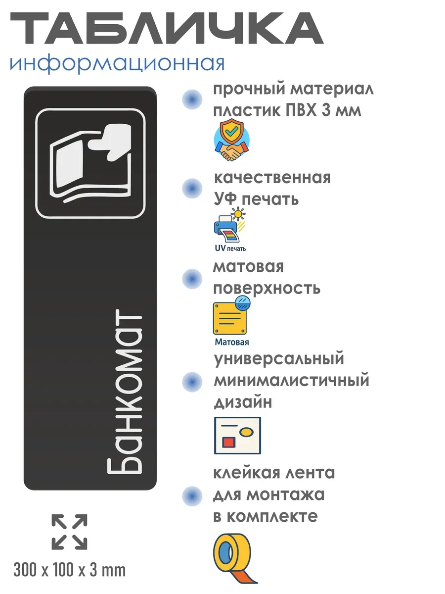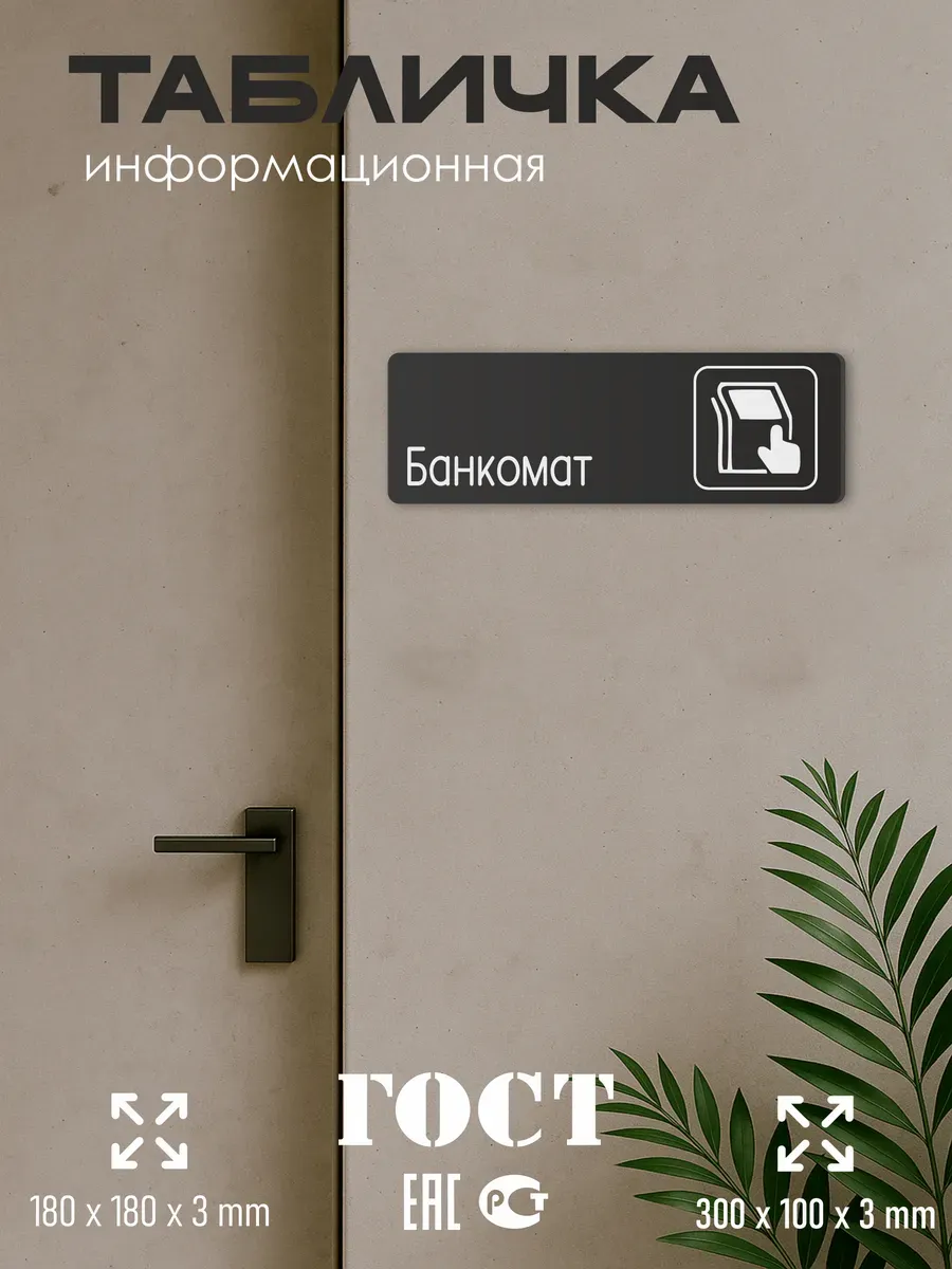 Табличка Банкомат интерьерная из черного ПВХ 3мм размером 30х10 см – это стильный и универсальный декоративный элемент, который поможет создать особую атмосферу в вашем интерьере. Изготовлена из высококачественного черного ПВХ, она обладает прочностью и долговечностью, что делает ее идеальным выбором для использования в различных помещениях. На табличке имеется возможность нанесения различных надписей, все представлены в ассортименте. Благодаря черному цвету и минималистичному дизайну, она легко сочетается с любым интерьером и стилем оформления. Эта табличка является универсальным решением для множества задач. Вы можете использовать ее для обозначения названий комнат, оповещения и предупреждения граждан. Она идеально подходит для дома, офиса, ресторана, гостиницы, в школу, в гос. учреждения, в клинику, в больницу, в фитнес клуб. В магазине представлены таблички с надписями: мужской туалет, женский туалет, офис, склад, место для курения, для персонала, курение запрещено, чистые бахилы, грязные бахилы, надевайте бахилы, женская раздевалка, мужская раздевалка, банкомат, бассейн, администрация, офис, буфет, камера хранения, прачечная, выключайте звуки телефона, туалет, комната матери и ребенка, вход, выход, генеральный директор, касса, информация, комната ожидания, не бросайте в унитаз туалетную бумагу и предметы гигиены, камера хранения, за оставленные вещи администрация ответственности не несет, ведется видеонаблюдение, выключайте звуки мобильного телефона