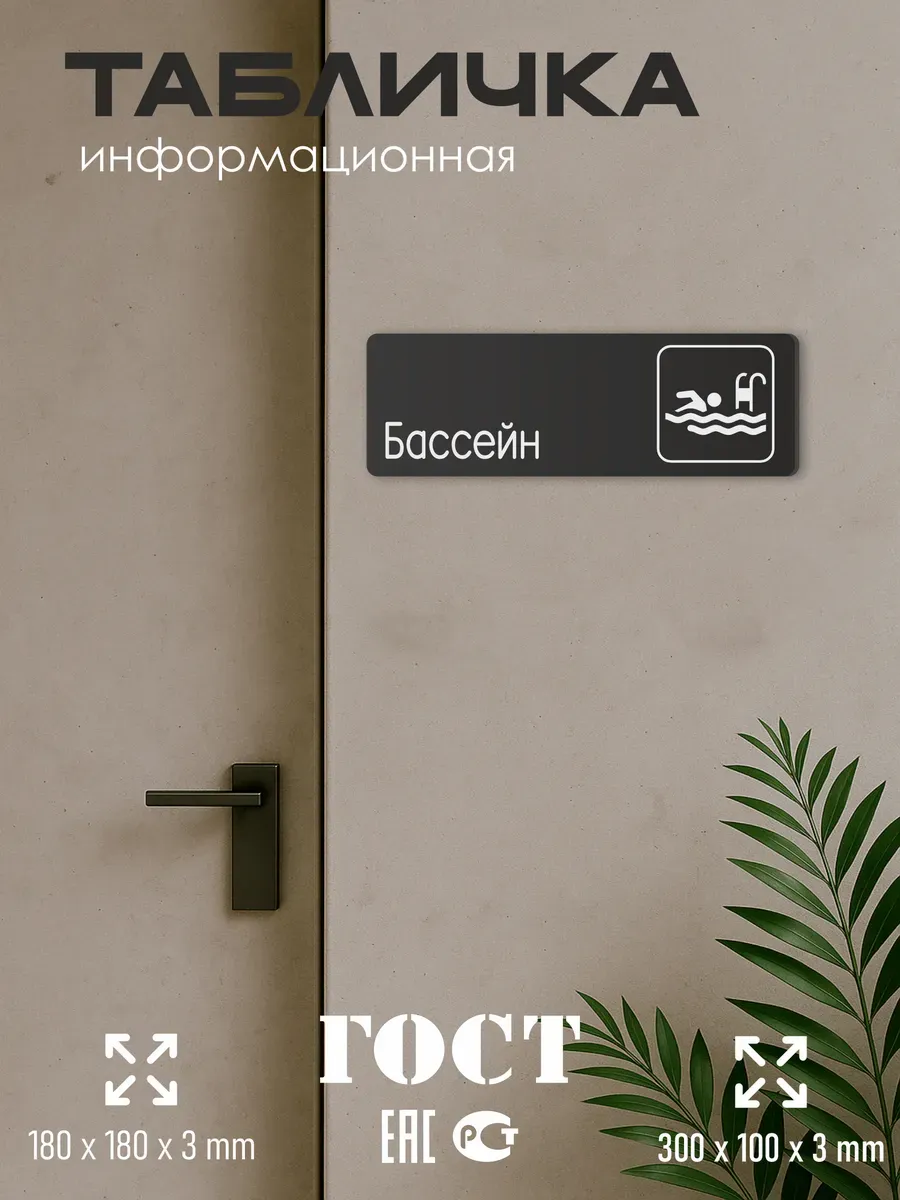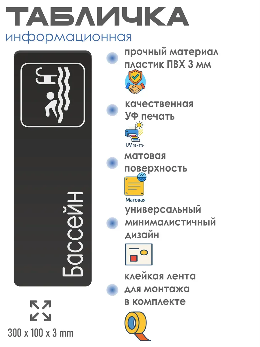 Табличка Бассейн интерьерная из черного ПВХ 3мм размером 30х10 см – это стильный и универсальный декоративный элемент, который поможет создать особую атмосферу в вашем интерьере. Изготовлена из высококачественного черного ПВХ, она обладает прочностью и долговечностью, что делает ее идеальным выбором для использования в различных помещениях. На табличке имеется возможность нанесения различных надписей, все представлены в ассортименте. Благодаря черному цвету и минималистичному дизайну, она легко сочетается с любым интерьером и стилем оформления. Эта табличка является универсальным решением для множества задач. Вы можете использовать ее для обозначения названий комнат, оповещения и предупреждения граждан. Она идеально подходит для дома, офиса, ресторана, гостиницы, в школу, в гос. учреждения, в клинику, в больницу, в фитнес клуб. В магазине представлены таблички с надписями: мужской туалет, женский туалет, офис, склад, место для курения, для персонала, курение запрещено, чистые бахилы, грязные бахилы, надевайте бахилы, женская раздевалка, мужская раздевалка, банкомат, бассейн, администрация, офис, буфет, камера хранения, прачечная, выключайте звуки телефона, туалет, комната матери и ребенка, вход, выход, генеральный директор, касса, информация, комната ожидания, не бросайте в унитаз туалетную бумагу и предметы гигиены, камера хранения, за оставленные вещи администрация ответственности не несет, ведется видеонаблюдение, выключайте звуки мобильного телефона
