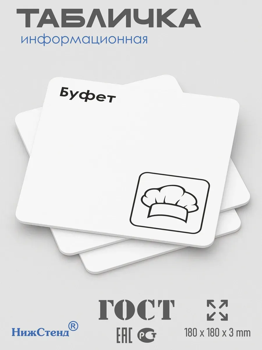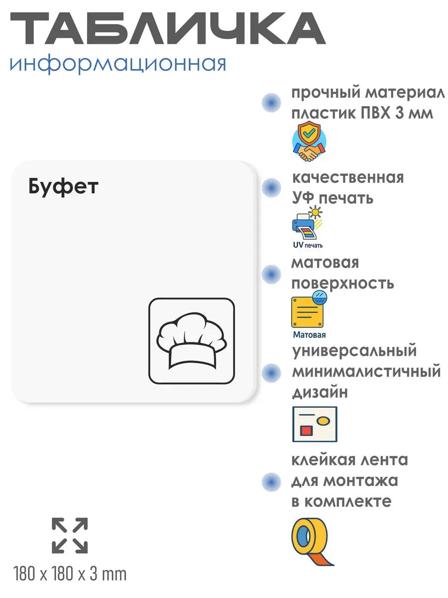 Табличка Буфет с двусторонней клейкой лентой для монтажа в комплекте интерьерная из ПВХ 3мм размером 18х18 см – это стильный и универсальный декоративный элемент, который поможет создать особую атмосферу в вашем интерьере. Изготовлена из высококачественного ПВХ, она обладает прочностью и долговечностью, что делает ее идеальным выбором для использования в различных помещениях. На табличке имеется возможность нанесения различных надписей, все представлены в ассортименте. Благодаря белому цвету и минималистичному дизайну, она легко сочетается с любым интерьером и стилем оформления. Эта табличка является универсальным решением для множества задач. Вы можете использовать ее для обозначения названий комнат, оповещения и предупреждения граждан. Она идеально подходит для дома, офиса, ресторана, гостиницы, в школу, в гос. учреждения, в клинику, в больницу, в фитнес клуб. В магазине представлены таблички с надписями: мужской туалет, женский туалет, офис, склад, место для курения, для персонала, курение запрещено, чистые бахилы, грязные бахилы, надевайте бахилы, женская раздевалка, мужская раздевалка, банкомат, бассейн, администрация, офис, буфет, камера хранения, прачечная, выключайте звуки телефона, туалет, комната матери и ребенка, вход, выход, генеральный директор, касса, информация, комната ожидания, не бросайте в унитаз туалетную бумагу и предметы гигиены, камера хранения, за оставленные вещи администрация ответственности не несет, ведется видеонаблюдение, выключайте звуки мобильного телефона