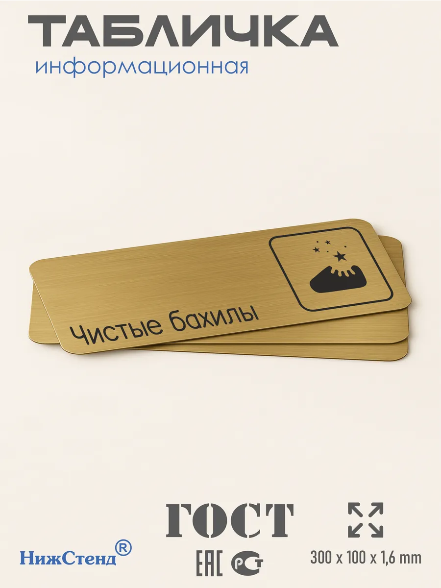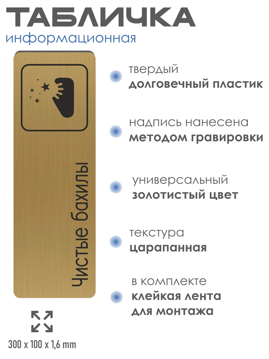 Табличка Чистые бахилы из золотистого пластика с царапанной текстурой размером 30х10 см. На обратной стороне таблички – двусторонняя клейкая лента для монтажа таблички без сверления. Текст и пиктограмма на табличку наносятся методом гравировки, такм образом изображение на табличке не будет сдираться, а также устойчиво к выгоранию и механическим повреждениям. При необходимости табличку можно протирать влажной тряпкой или салфетками. Табличка с гравировкой с надписью Чистые бахилы имеет сертификат ГОСТ и изготовлена из материалов не поддерживающих горение