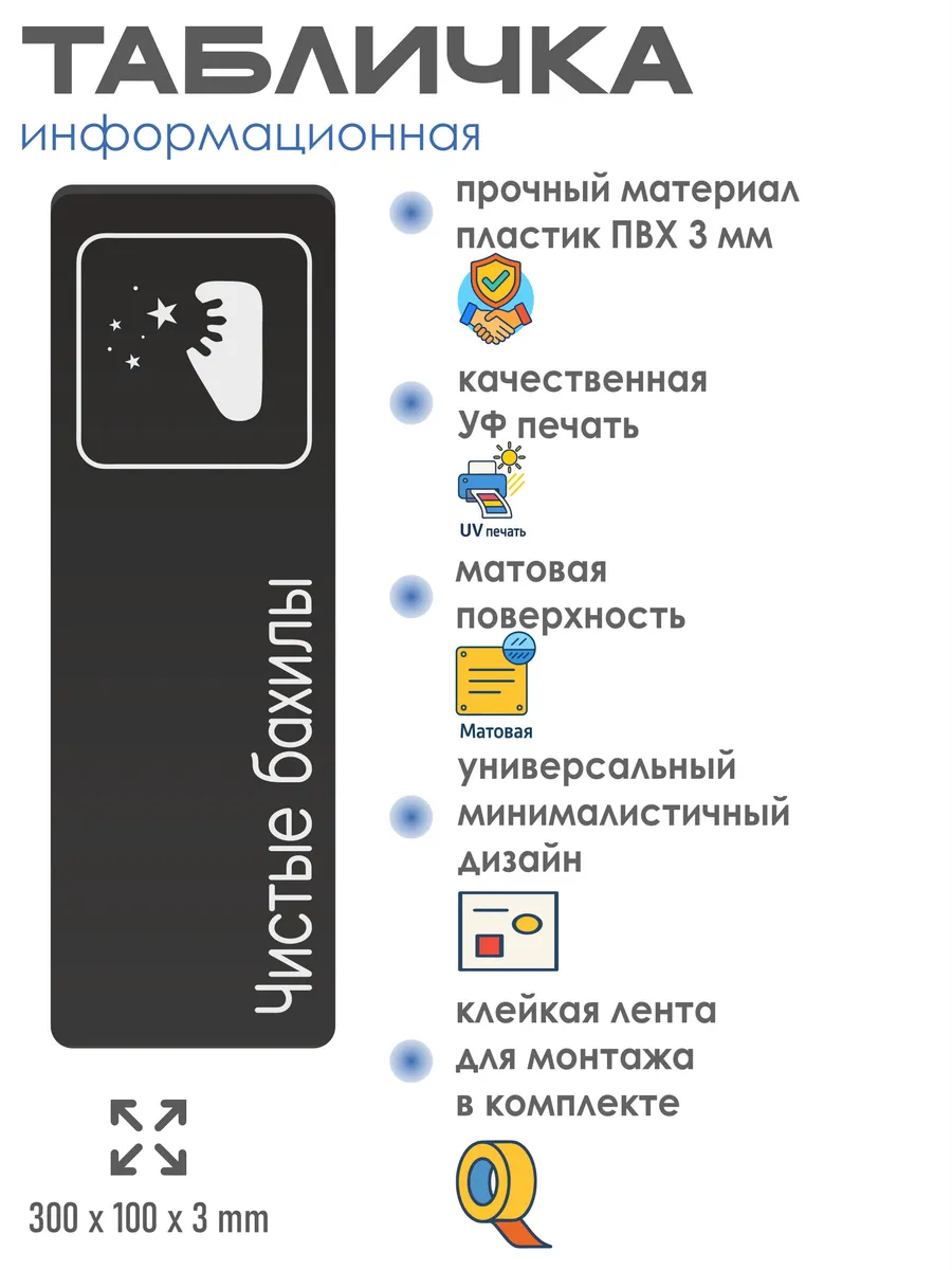 Табличка Чистые бахилы интерьерная из черного ПВХ 3мм размером 30х10 см – это стильный и универсальный декоративный элемент, который поможет создать особую атмосферу в вашем интерьере. Изготовлена из высококачественного черного ПВХ, она обладает прочностью и долговечностью, что делает ее идеальным выбором для использования в различных помещениях. На табличке имеется возможность нанесения различных надписей, все представлены в ассортименте. Благодаря черному цвету и минималистичному дизайну, она легко сочетается с любым интерьером и стилем оформления. Эта табличка является универсальным решением для множества задач. Вы можете использовать ее для обозначения названий комнат, оповещения и предупреждения граждан. Она идеально подходит для дома, офиса, ресторана, гостиницы, в школу, в гос. учреждения, в клинику, в больницу, в фитнес клуб. В магазине представлены таблички с надписями: мужской туалет, женский туалет, офис, склад, место для курения, для персонала, курение запрещено, чистые бахилы, грязные бахилы, надевайте бахилы, женская раздевалка, мужская раздевалка, банкомат, бассейн, администрация, офис, буфет, камера хранения, прачечная, выключайте звуки телефона, туалет, комната матери и ребенка, вход, выход, генеральный директор, касса, информация, комната ожидания, не бросайте в унитаз туалетную бумагу и предметы гигиены, камера хранения, за оставленные вещи администрация ответственности не несет, ведется видеонаблюдение, выключайте звуки мобильного телефона