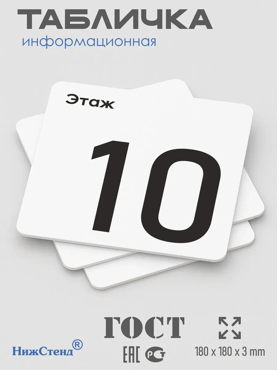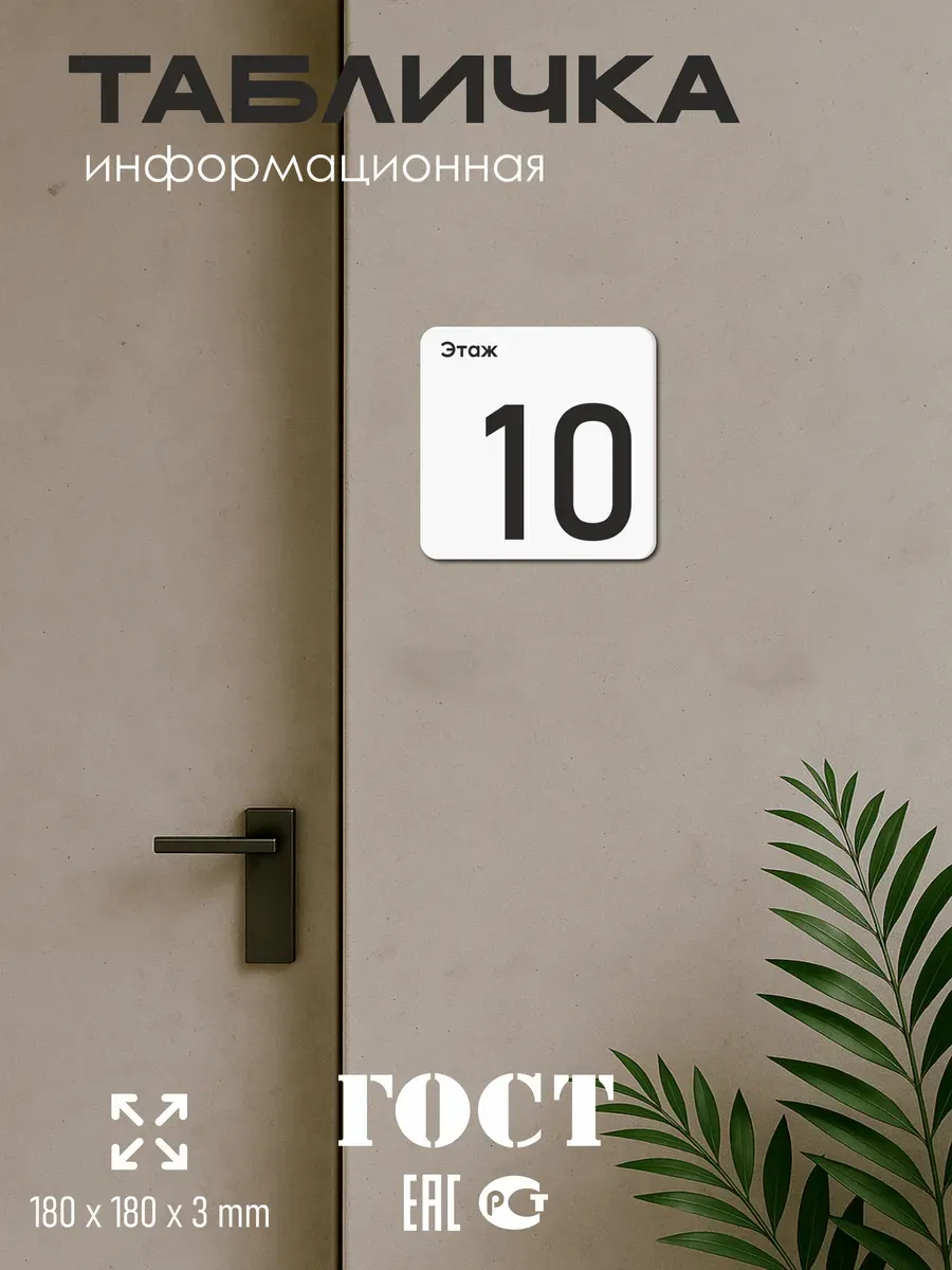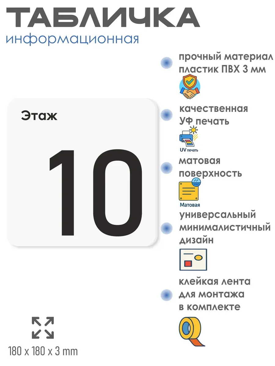 Табличка десятый 10 этаж с двусторонней клейкой лентой для монтажа в комплекте директор интерьерная из ПВХ 3мм размером 18х18 см – это стильный и универсальный декоративный элемент, который поможет создать особую атмосферу в вашем интерьере. Изготовлена из высококачественного ПВХ, она обладает прочностью и долговечностью, что делает ее идеальным выбором для использования в различных помещениях. На табличке имеется возможность нанесения различных надписей, все представлены в ассортименте. Благодаря белому цвету и минималистичному дизайну, она легко сочетается с любым интерьером и стилем оформления. Эта табличка является универсальным решением для множества задач. Вы можете использовать ее для обозначения названий комнат, оповещения и предупреждения граждан. Она идеально подходит для дома, офиса, ресторана, гостиницы, в школу, в гос. учреждения, в клинику, в больницу, в фитнес клуб. В магазине представлены таблички с надписями: мужской туалет, женский туалет, офис, склад, место для курения, для персонала, курение запрещено, чистые бахилы, грязные бахилы, надевайте бахилы, женская раздевалка, мужская раздевалка, банкомат, бассейн, администрация, офис, буфет, камера хранения, прачечная, выключайте звуки телефона, туалет, комната матери и ребенка, вход, выход, генеральный директор, касса, информация, комната ожидания, не бросайте в унитаз туалетную бумагу и предметы гигиены, камера хранения, за оставленные вещи администрация ответственности не несет, ведется видеонаблюдение, выключайте звуки мобильного телефона