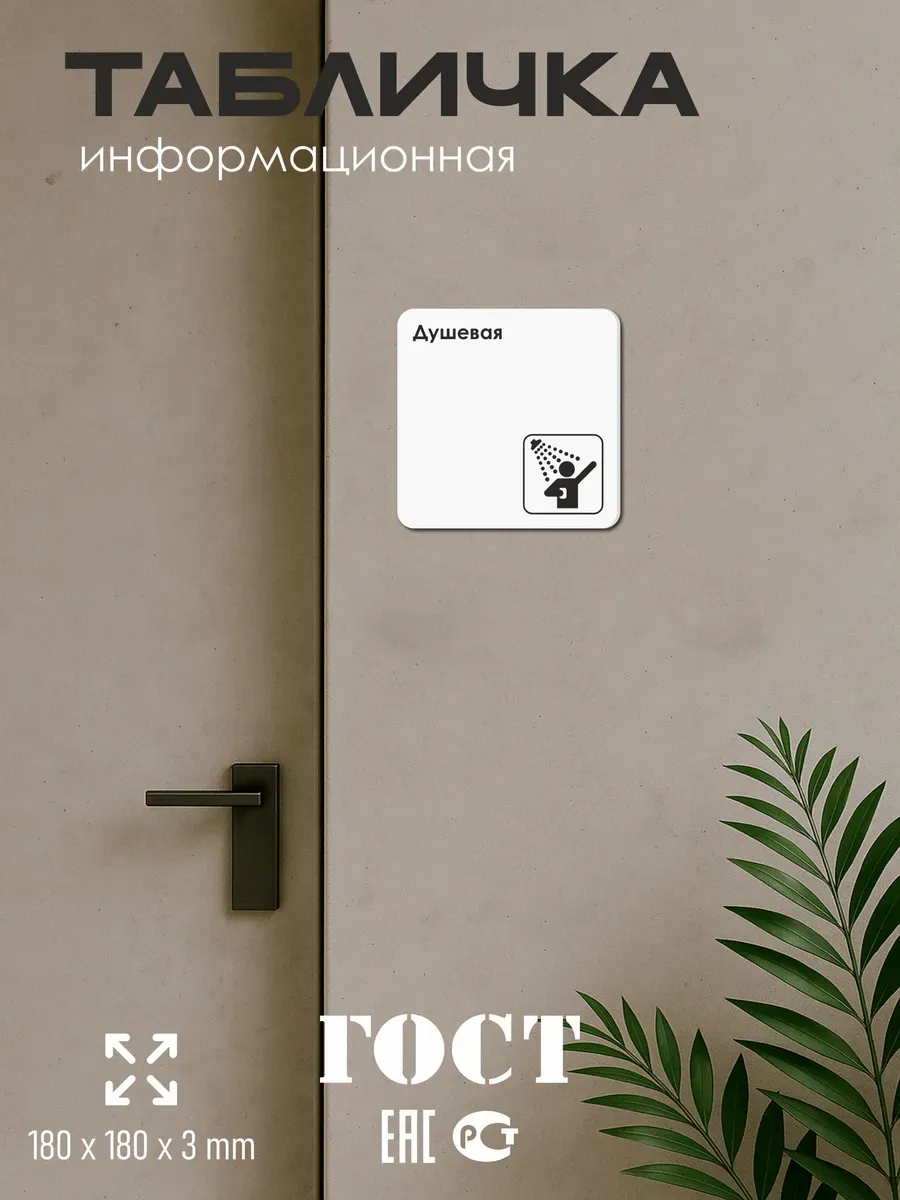 Табличка Душевая с двусторонней клейкой лентой для монтажа в комплекте интерьерная из ПВХ 3мм размером 18х18 см – это стильный и универсальный декоративный элемент, который поможет создать особую атмосферу в вашем интерьере. Изготовлена из высококачественного ПВХ, она обладает прочностью и долговечностью, что делает ее идеальным выбором для использования в различных помещениях. На табличке имеется возможность нанесения различных надписей, все представлены в ассортименте. Благодаря белому цвету и минималистичному дизайну, она легко сочетается с любым интерьером и стилем оформления. Эта табличка является универсальным решением для множества задач. Вы можете использовать ее для обозначения названий комнат, оповещения и предупреждения граждан. Она идеально подходит для дома, офиса, ресторана, гостиницы, в школу, в гос. учреждения, в клинику, в больницу, в фитнес клуб. В магазине представлены таблички с надписями: мужской туалет, женский туалет, офис, склад, место для курения, для персонала, курение запрещено, чистые бахилы, грязные бахилы, надевайте бахилы, женская раздевалка, мужская раздевалка, банкомат, бассейн, администрация, офис, буфет, камера хранения, прачечная, выключайте звуки телефона, туалет, комната матери и ребенка, вход, выход, генеральный директор, касса, информация, комната ожидания, не бросайте в унитаз туалетную бумагу и предметы гигиены, камера хранения, за оставленные вещи администрация ответственности не несет, ведется видеонаблюдение, выключайте звуки мобильного телефона