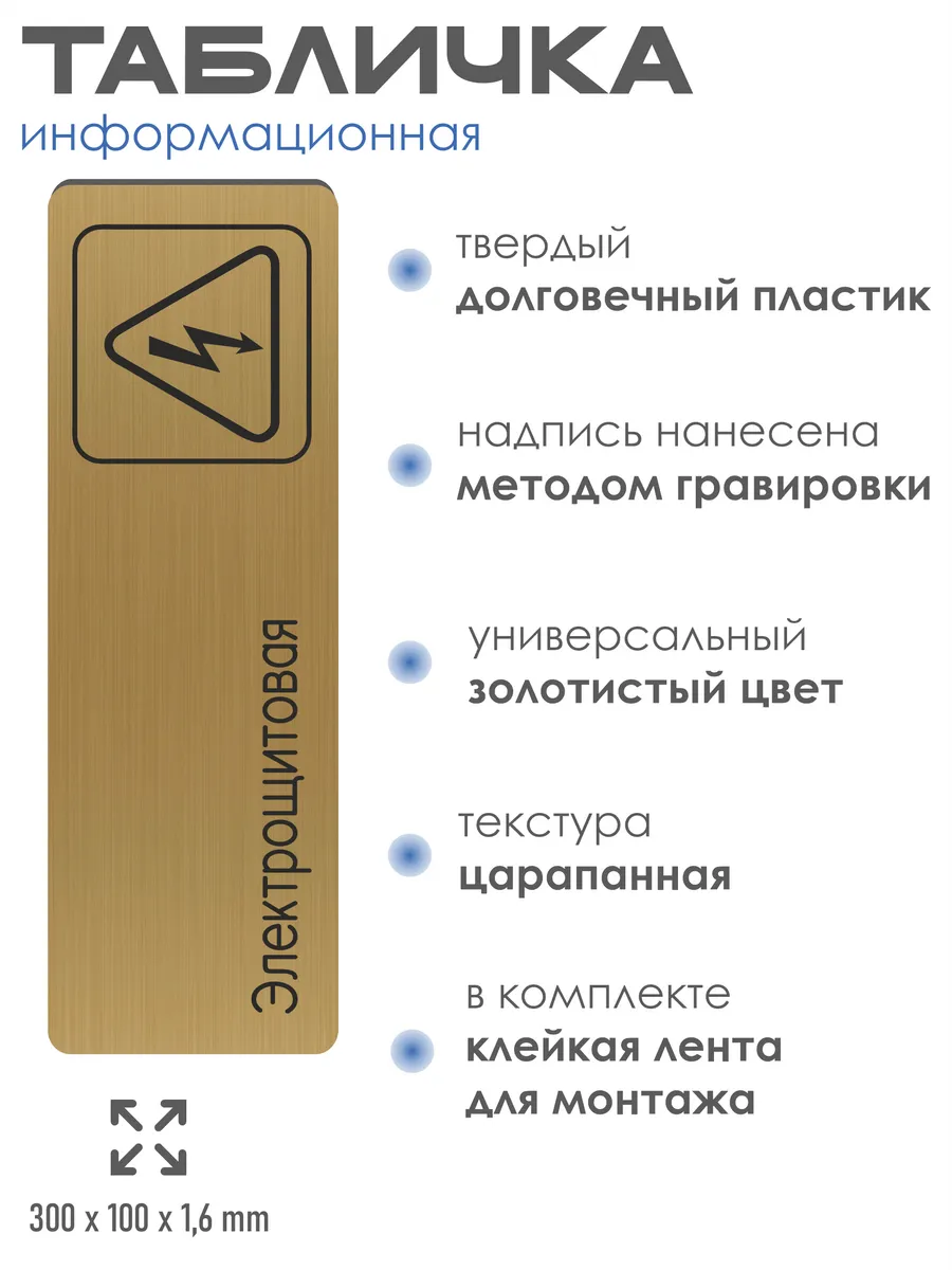 Табличка Электрощитовая из золотистого пластика с царапанной текстурой размером 30х10 см. На обратной стороне таблички – двусторонняя клейкая лента для монтажа таблички без сверления. Текст и пиктограмма на табличку наносятся методом гравировки, такм образом изображение на табличке не будет сдираться, а также устойчиво к выгоранию и механическим повреждениям. При необходимости табличку можно протирать влажной тряпкой или салфетками. Табличка с гравировкой с надписью Электрощитовая имеет сертификат ГОСТ и изготовлена из материалов не поддерживающих горение