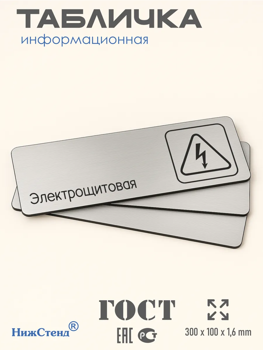 Табличка Электрощитовая из серебристого пластика с царапанной текстурой размером 30х10 см. На обратной стороне таблички – двусторонняя клейкая лента для монтажа таблички без сверления. Текст и пиктограмма на табличку наносятся методом гравировки, такм образом изображение на табличке не будет сдираться, а также устойчиво к выгоранию и механическим повреждениям. При необходимости табличку можно протирать влажной тряпкой или салфетками. Табличка с гравировкой с надписью Электрощитовая имеет сертификат ГОСТ и изготовлена из материалов не поддерживающих горение