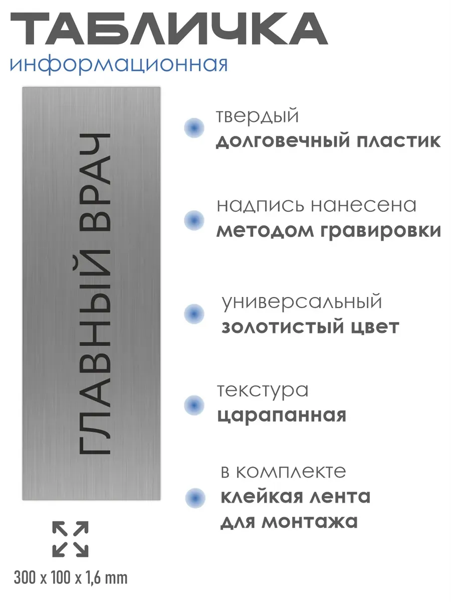 Табличка на кабинет – важная часть любого учреждения. Название кабинета поможет посетителям сориентироваться в планировке здания и быстро найти нужный кабинет. Главное в изготовлении таблички на дверь: информация должна быть ясной и хорошо читаемой. Табличка из шенгвея толщиной 2мм (пластик для гравировки) с царапаной текстурой. Табличка с названием кабинета врача не выгорает, изображение не сдирается, при необходимости можно мыть. В комплекте – профессиональный двухсторонний скотч для монтажа таблички. Информационные таблички с гравировкой на дверь, на кабинет или на стену идеальны для интерьера любого медицинского учреждения: больница, поликлиника, клиника и создадут правильную рабочую обстановку, особый стиль в помещении. Товар имеет сертификат ГОСТ и изготовлен из нетоксичных материалов. В случае возникновения вопросов, пожалуйста, задайте нам вопрос в разделе “Вопросы” и мы обязательно Вам ответим! В нашем магазине есть и другие товары для интерьера помещения: классные уголки, информационные стенды, таблички на кабинет в офис, школу, дом. Будем очень признательны, если вы оставите нам отзыв на нашу продукцию! Надеемся увидеть вас в числе наших покупателей!