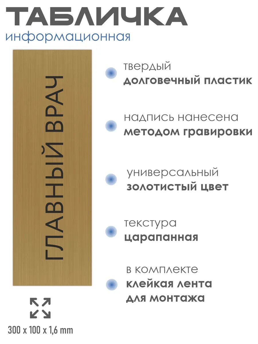 Табличка на кабинет – важная часть любого учреждения. Название кабинета поможет посетителям сориентироваться в планировке здания и быстро найти нужный кабинет. Главное в изготовлении таблички на дверь: информация должна быть ясной и хорошо читаемой. Табличка из шенгвея толщиной 2мм (пластик для гравировки) с царапаной текстурой. Табличка с названием кабинета врача не выгорает, изображение не сдирается, при необходимости можно мыть. В комплекте – профессиональный двухсторонний скотч для монтажа таблички. Информационные таблички с гравировкой на дверь, на кабинет или на стену идеальны для интерьера любого медицинского учреждения: больница, поликлиника, клиника и создадут правильную рабочую обстановку, особый стиль в помещении. Товар имеет сертификат ГОСТ и изготовлен из нетоксичных материалов. В случае возникновения вопросов, пожалуйста, задайте нам вопрос в разделе “Вопросы” и мы обязательно Вам ответим! В нашем магазине есть и другие товары для интерьера помещения: классные уголки, информационные стенды, таблички на кабинет в офис, школу, дом. Будем очень признательны, если вы оставите нам отзыв на нашу продукцию! Надеемся увидеть вас в числе наших покупателей!