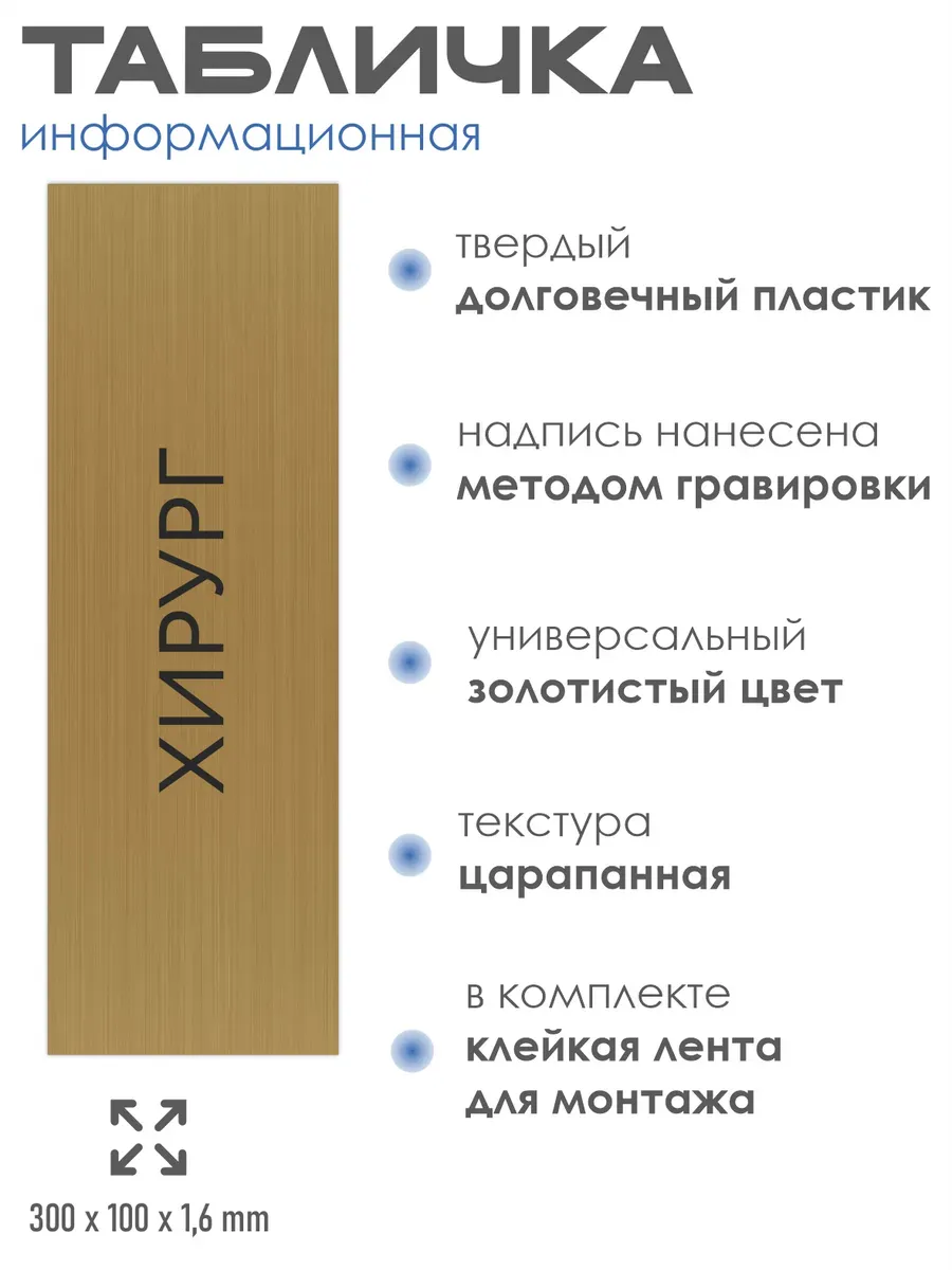 Будьте первым, кто оставил отзыв на “Табличка Хирург 300/100 мм на кабинет дверь стену золото”