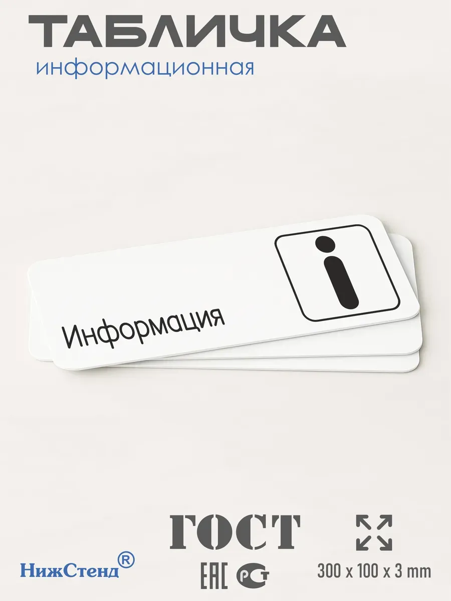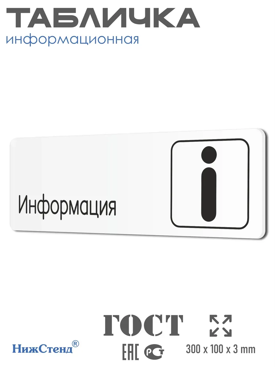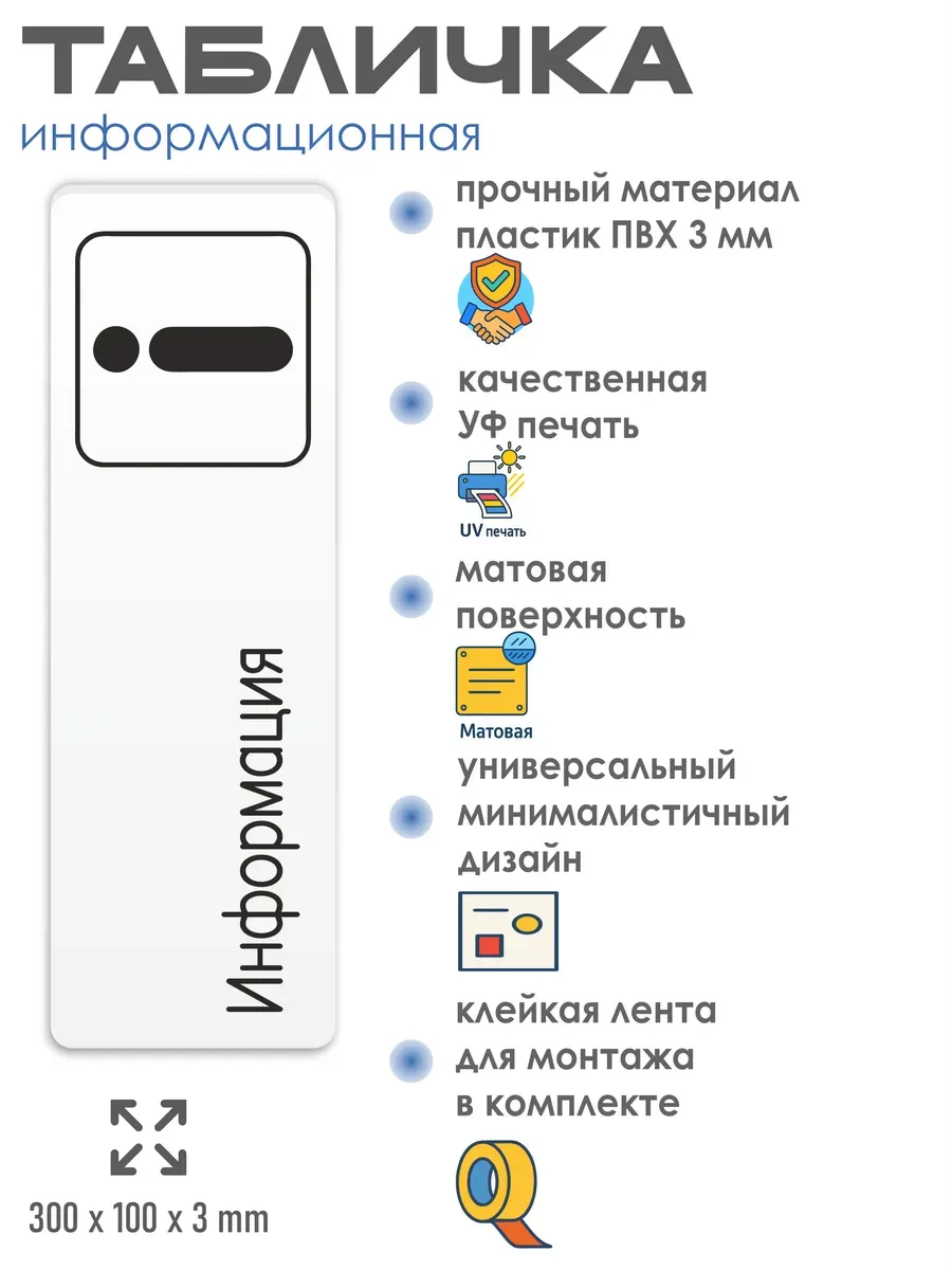 Табличка Информация с двусторонней клейкой лентой для монтажа в комплекте интерьерная из ПВХ 3мм размером 30х10 см – это стильный и универсальный декоративный элемент, который поможет создать особую атмосферу в вашем интерьере. Изготовлена из высококачественного ПВХ, она обладает прочностью и долговечностью, что делает ее идеальным выбором для использования в различных помещениях. На табличке имеется возможность нанесения различных надписей, все представлены в ассортименте. Благодаря белому цвету и минималистичному дизайну, она легко сочетается с любым интерьером и стилем оформления. Эта табличка является универсальным решением для множества задач. Вы можете использовать ее для обозначения названий комнат, оповещения и предупреждения граждан. Она идеально подходит для дома, офиса, ресторана, гостиницы, в школу, в гос. учреждения, в клинику, в больницу, в фитнес клуб. В магазине представлены таблички с надписями: мужской туалет, женский туалет, офис, склад, место для курения, для персонала, курение запрещено, чистые бахилы, грязные бахилы, надевайте бахилы, женская раздевалка, мужская раздевалка, банкомат, бассейн, администрация, офис, буфет, камера хранения, прачечная, выключайте звуки телефона, туалет, комната матери и ребенка, вход, выход, генеральный директор, касса, информация, комната ожидания, не бросайте в унитаз туалетную бумагу и предметы гигиены, камера хранения, за оставленные вещи администрация ответственности не несет, ведется видеонаблюдение, выключайте звуки мобильного телефона