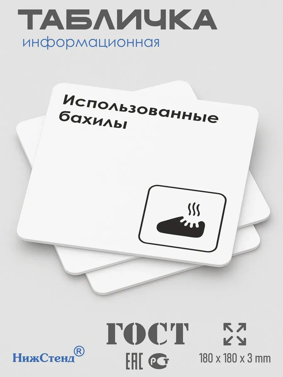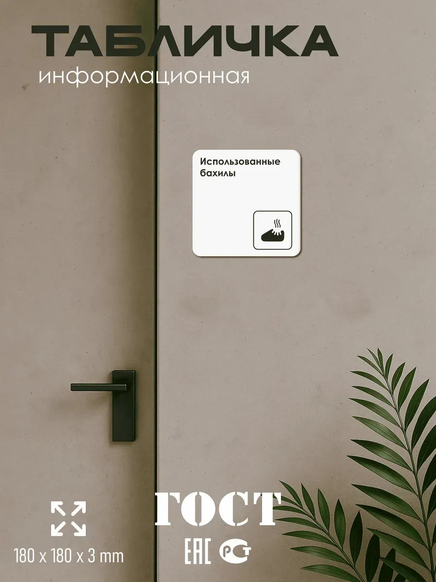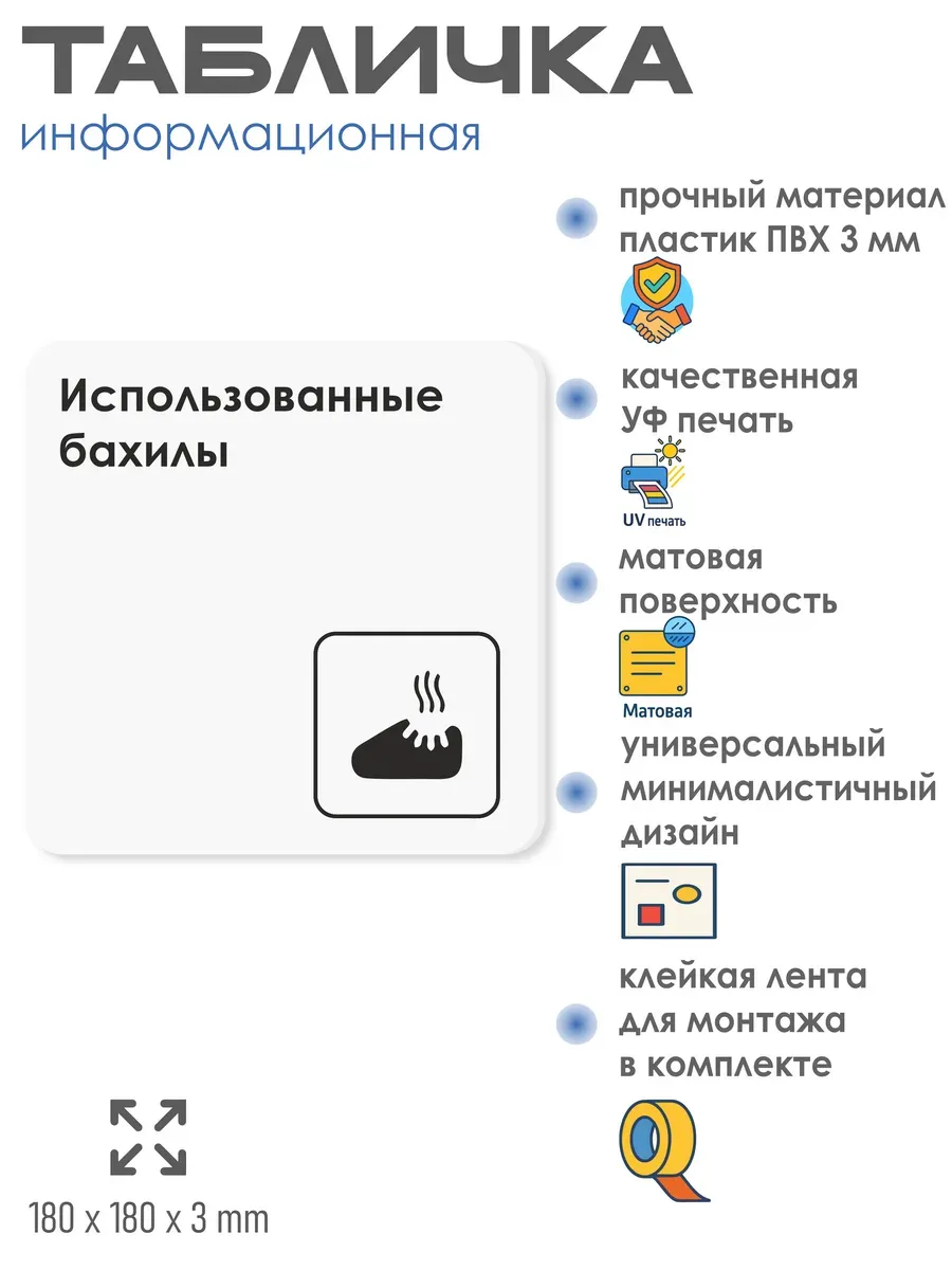 Табличка Использованные бахилы с двусторонней клейкой лентой для монтажа в комплекте интерьерная из ПВХ 3мм размером 18х18 см – это стильный и универсальный декоративный элемент, который поможет создать особую атмосферу в вашем интерьере. Изготовлена из высококачественного ПВХ, она обладает прочностью и долговечностью, что делает ее идеальным выбором для использования в различных помещениях. На табличке имеется возможность нанесения различных надписей, все представлены в ассортименте. Благодаря белому цвету и минималистичному дизайну, она легко сочетается с любым интерьером и стилем оформления. Эта табличка является универсальным решением для множества задач. Вы можете использовать ее для обозначения названий комнат, оповещения и предупреждения граждан. Она идеально подходит для дома, офиса, ресторана, гостиницы, в школу, в гос. учреждения, в клинику, в больницу, в фитнес клуб. В магазине представлены таблички с надписями: мужской туалет, женский туалет, офис, склад, место для курения, для персонала, курение запрещено, чистые бахилы, грязные бахилы, надевайте бахилы, женская раздевалка, мужская раздевалка, банкомат, бассейн, администрация, офис, буфет, камера хранения, прачечная, выключайте звуки телефона, туалет, комната матери и ребенка, вход, выход, генеральный директор, касса, информация, комната ожидания, не бросайте в унитаз туалетную бумагу и предметы гигиены, камера хранения, за оставленные вещи администрация ответственности не несет, ведется видеонаблюдение, выключайте звуки мобильного телефона
