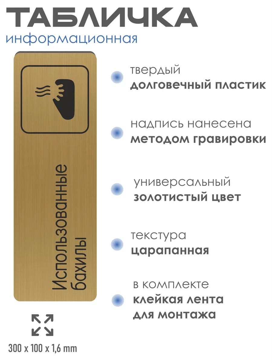 Табличка Использованные бахилы из золотистого пластика с царапанной текстурой размером 30х10 см. На обратной стороне таблички – двусторонняя клейкая лента для монтажа таблички без сверления. Текст и пиктограмма на табличку наносятся методом гравировки, такм образом изображение на табличке не будет сдираться, а также устойчиво к выгоранию и механическим повреждениям. При необходимости табличку можно протирать влажной тряпкой или салфетками. Табличка с гравировкой с надписью Использованные бахилы имеет сертификат ГОСТ и изготовлена из материалов не поддерживающих горение