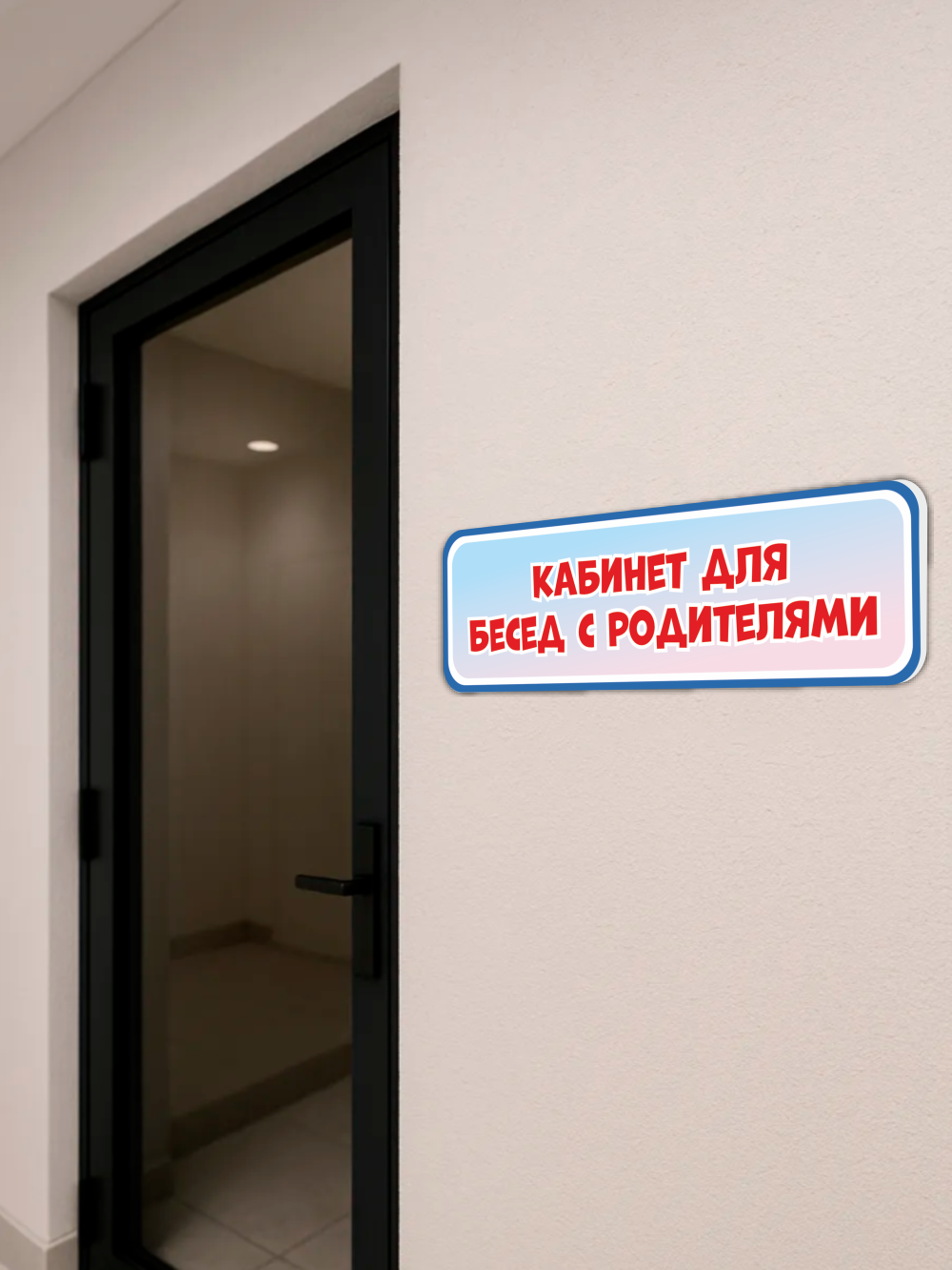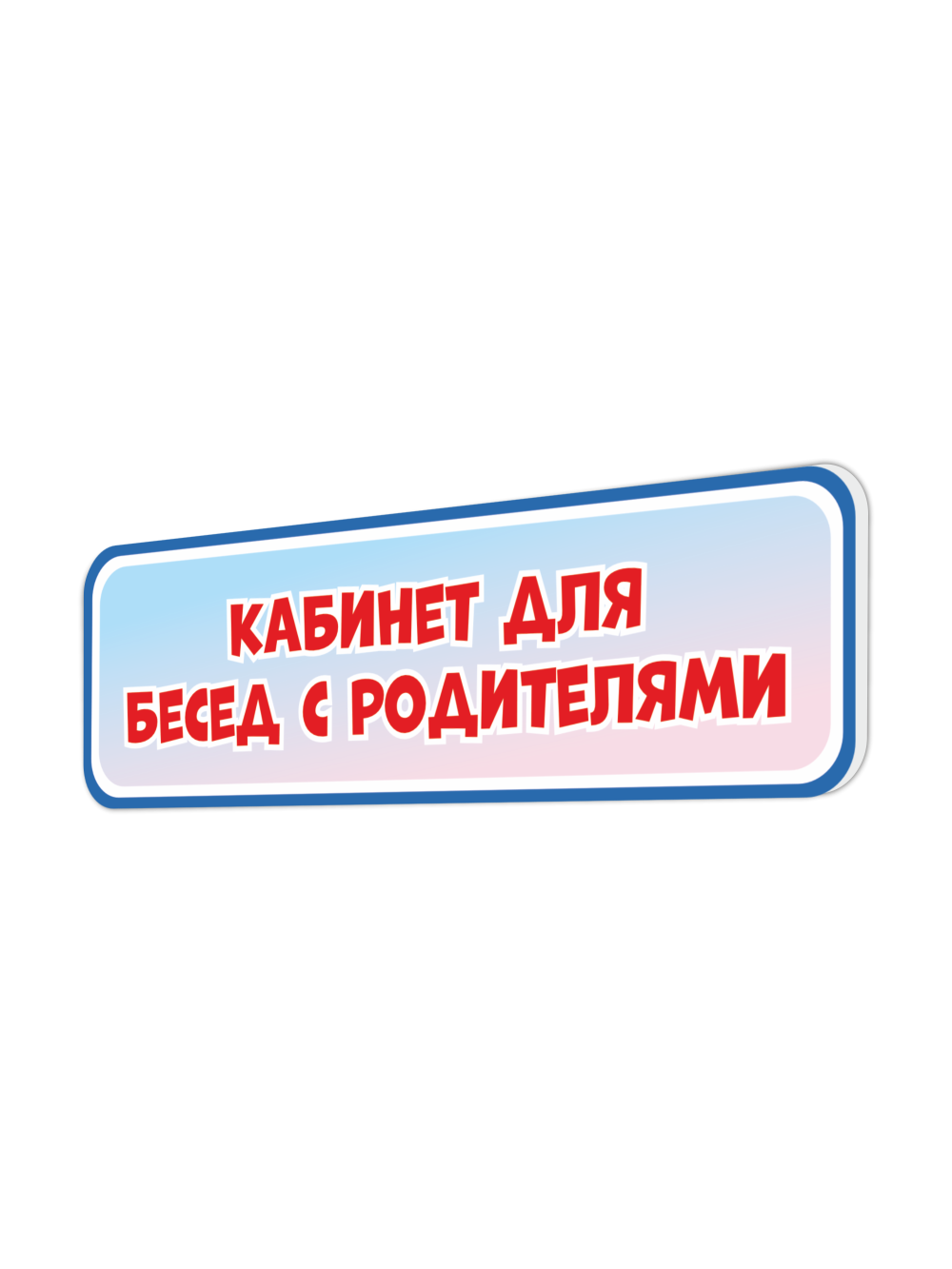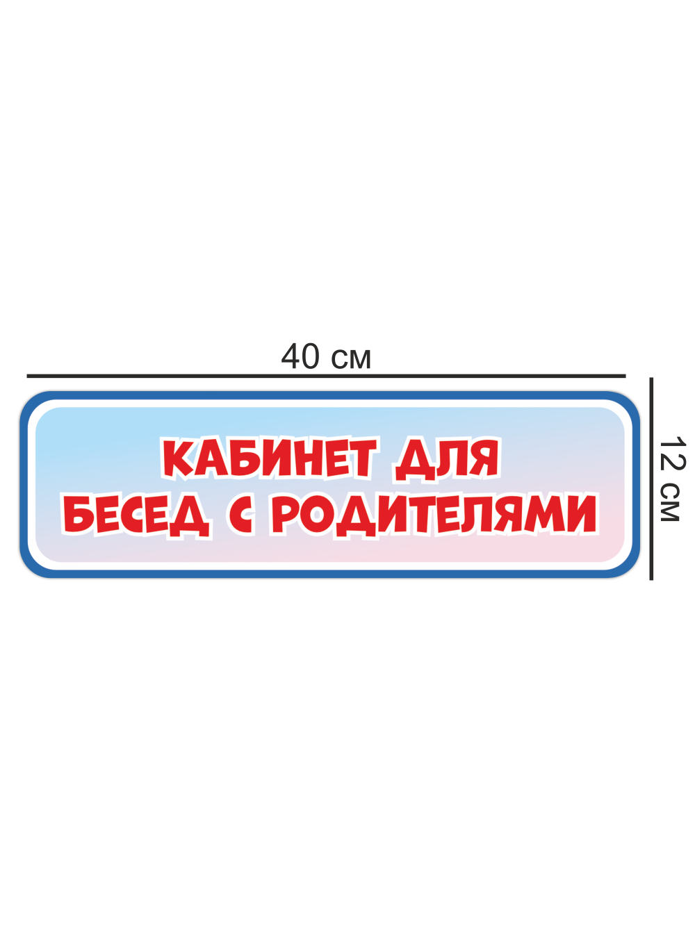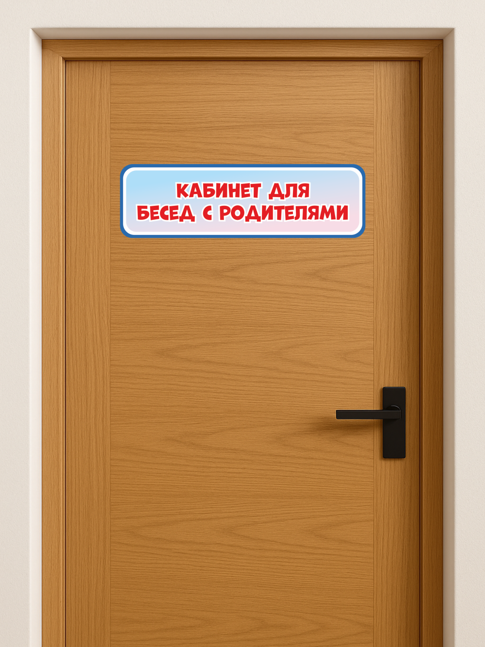 Табличка «Кабинет для бесед с родителями» предназначена для оформления помещений в образовательных учреждениях — детских садах, школах, центрах развития и других организациях, где проводятся встречи и консультации с родителями. Изготовлена из прочного ПВХ толщиной 3 мм, размер изделия — 40×12 см.