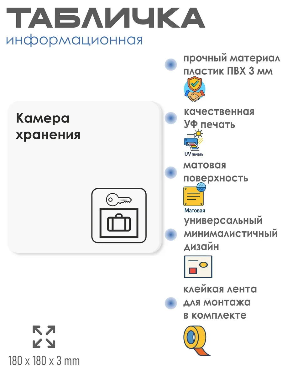 Табличка Камера хранения с двусторонней клейкой лентой для монтажа в комплекте интерьерная из ПВХ 3мм размером 18х18 см – это стильный и универсальный декоративный элемент, который поможет создать особую атмосферу в вашем интерьере. Изготовлена из высококачественного ПВХ, она обладает прочностью и долговечностью, что делает ее идеальным выбором для использования в различных помещениях. На табличке имеется возможность нанесения различных надписей, все представлены в ассортименте. Благодаря белому цвету и минималистичному дизайну, она легко сочетается с любым интерьером и стилем оформления. Эта табличка является универсальным решением для множества задач. Вы можете использовать ее для обозначения названий комнат, оповещения и предупреждения граждан. Она идеально подходит для дома, офиса, ресторана, гостиницы, в школу, в гос. учреждения, в клинику, в больницу, в фитнес клуб. В магазине представлены таблички с надписями: мужской туалет, женский туалет, офис, склад, место для курения, для персонала, курение запрещено, чистые бахилы, грязные бахилы, надевайте бахилы, женская раздевалка, мужская раздевалка, банкомат, бассейн, администрация, офис, буфет, камера хранения, прачечная, выключайте звуки телефона, туалет, комната матери и ребенка, вход, выход, генеральный директор, касса, информация, комната ожидания, не бросайте в унитаз туалетную бумагу и предметы гигиены, камера хранения, за оставленные вещи администрация ответственности не несет, ведется видеонаблюдение, выключайте звуки мобильного телефона