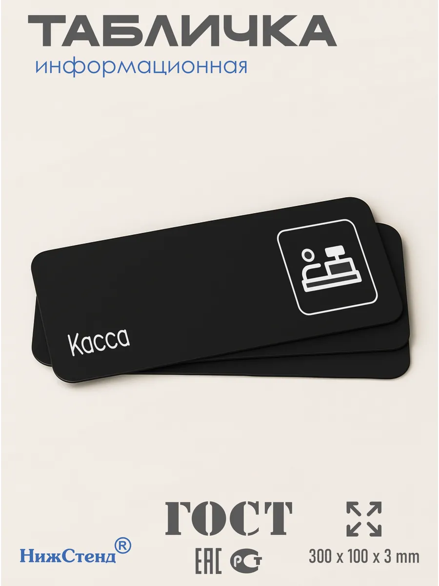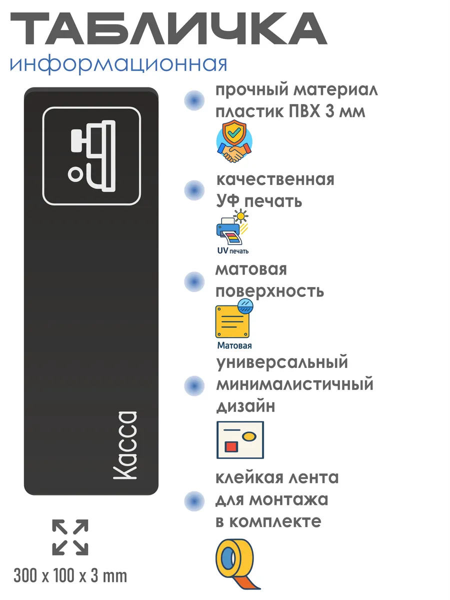 Табличка Касса интерьерная из черного ПВХ 3мм размером 30х10 см – это стильный и универсальный декоративный элемент, который поможет создать особую атмосферу в вашем интерьере. Изготовлена из высококачественного черного ПВХ, она обладает прочностью и долговечностью, что делает ее идеальным выбором для использования в различных помещениях. На табличке имеется возможность нанесения различных надписей, все представлены в ассортименте. Благодаря черному цвету и минималистичному дизайну, она легко сочетается с любым интерьером и стилем оформления. Эта табличка является универсальным решением для множества задач. Вы можете использовать ее для обозначения названий комнат, оповещения и предупреждения граждан. Она идеально подходит для дома, офиса, ресторана, гостиницы, в школу, в гос. учреждения, в клинику, в больницу, в фитнес клуб. В магазине представлены таблички с надписями: мужской туалет, женский туалет, офис, склад, место для курения, для персонала, курение запрещено, чистые бахилы, грязные бахилы, надевайте бахилы, женская раздевалка, мужская раздевалка, банкомат, бассейн, администрация, офис, буфет, камера хранения, прачечная, выключайте звуки телефона, туалет, комната матери и ребенка, вход, выход, генеральный директор, касса, информация, комната ожидания, не бросайте в унитаз туалетную бумагу и предметы гигиены, камера хранения, за оставленные вещи администрация ответственности не несет, ведется видеонаблюдение, выключайте звуки мобильного телефона