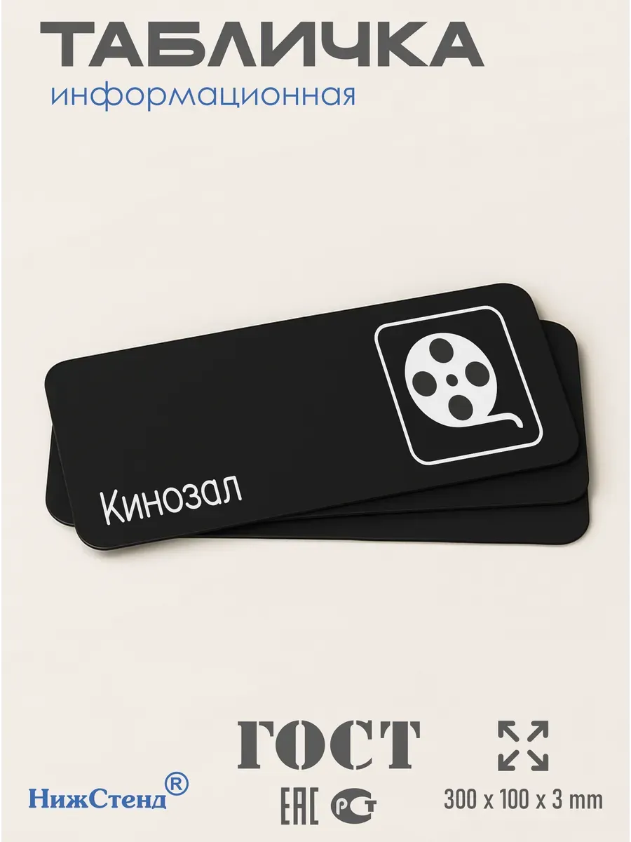 Табличка Кинозал интерьерная из черного ПВХ 3мм размером 30х10 см – это стильный и универсальный декоративный элемент, который поможет создать особую атмосферу в вашем интерьере. Изготовлена из высококачественного черного ПВХ, она обладает прочностью и долговечностью, что делает ее идеальным выбором для использования в различных помещениях. На табличке имеется возможность нанесения различных надписей, все представлены в ассортименте. Благодаря черному цвету и минималистичному дизайну, она легко сочетается с любым интерьером и стилем оформления. Эта табличка является универсальным решением для множества задач. Вы можете использовать ее для обозначения названий комнат, оповещения и предупреждения граждан. Она идеально подходит для дома, офиса, ресторана, гостиницы, в школу, в гос. учреждения, в клинику, в больницу, в фитнес клуб. В магазине представлены таблички с надписями: мужской туалет, женский туалет, офис, склад, место для курения, для персонала, курение запрещено, чистые бахилы, грязные бахилы, надевайте бахилы, женская раздевалка, мужская раздевалка, банкомат, бассейн, администрация, офис, буфет, камера хранения, прачечная, выключайте звуки телефона, туалет, комната матери и ребенка, вход, выход, генеральный директор, касса, информация, комната ожидания, не бросайте в унитаз туалетную бумагу и предметы гигиены, камера хранения, за оставленные вещи администрация ответственности не несет, ведется видеонаблюдение, выключайте звуки мобильного телефона