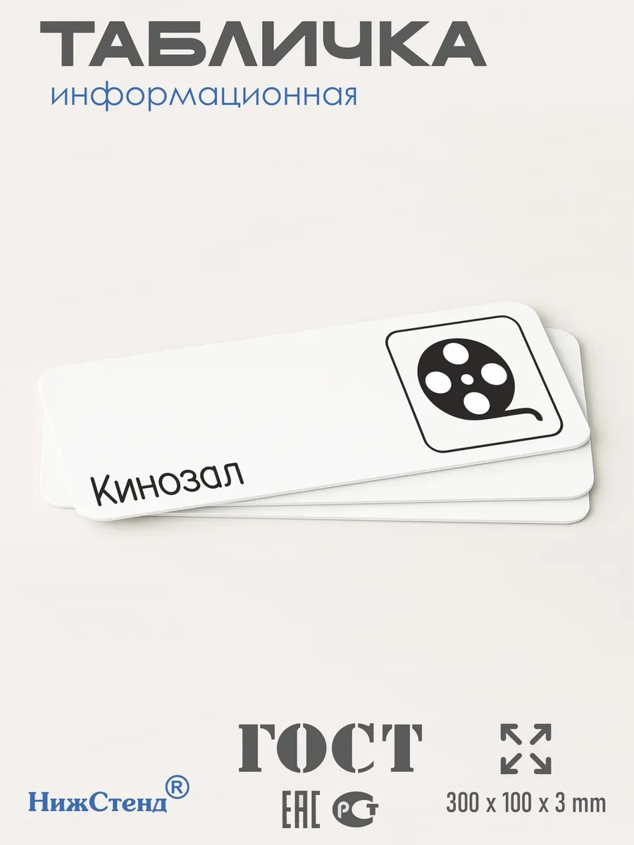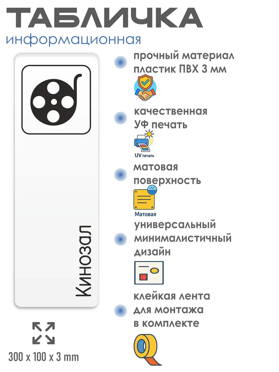 Табличка Кинозал с двусторонней клейкой лентой для монтажа в комплекте интерьерная из ПВХ 3мм размером 30х10 см – это стильный и универсальный декоративный элемент, который поможет создать особую атмосферу в вашем интерьере. Изготовлена из высококачественного ПВХ, она обладает прочностью и долговечностью, что делает ее идеальным выбором для использования в различных помещениях. На табличке имеется возможность нанесения различных надписей, все представлены в ассортименте. Благодаря белому цвету и минималистичному дизайну, она легко сочетается с любым интерьером и стилем оформления. Эта табличка является универсальным решением для множества задач. Вы можете использовать ее для обозначения названий комнат, оповещения и предупреждения граждан. Она идеально подходит для дома, офиса, ресторана, гостиницы, в школу, в гос. учреждения, в клинику, в больницу, в фитнес клуб. В магазине представлены таблички с надписями: мужской туалет, женский туалет, офис, склад, место для курения, для персонала, курение запрещено, чистые бахилы, грязные бахилы, надевайте бахилы, женская раздевалка, мужская раздевалка, банкомат, бассейн, администрация, офис, буфет, камера хранения, прачечная, выключайте звуки телефона, туалет, комната матери и ребенка, вход, выход, генеральный директор, касса, информация, комната ожидания, не бросайте в унитаз туалетную бумагу и предметы гигиены, камера хранения, за оставленные вещи администрация ответственности не несет, ведется видеонаблюдение, выключайте звуки мобильного телефона
