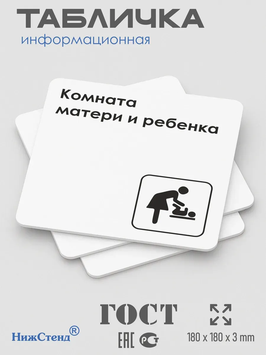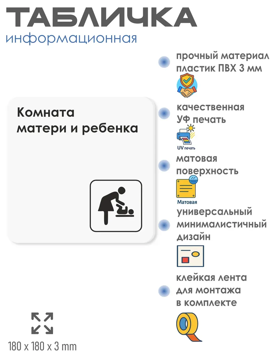 Табличка Комната матери и ребенка с двусторонней клейкой лентой для монтажа в комплекте интерьерная из ПВХ 3мм размером 18х18 см – это стильный и универсальный декоративный элемент, который поможет создать особую атмосферу в вашем интерьере. Изготовлена из высококачественного ПВХ, она обладает прочностью и долговечностью, что делает ее идеальным выбором для использования в различных помещениях. На табличке имеется возможность нанесения различных надписей, все представлены в ассортименте. Благодаря белому цвету и минималистичному дизайну, она легко сочетается с любым интерьером и стилем оформления. Эта табличка является универсальным решением для множества задач. Вы можете использовать ее для обозначения названий комнат, оповещения и предупреждения граждан. Она идеально подходит для дома, офиса, ресторана, гостиницы, в школу, в гос. учреждения, в клинику, в больницу, в фитнес клуб. В магазине представлены таблички с надписями: мужской туалет, женский туалет, офис, склад, место для курения, для персонала, курение запрещено, чистые бахилы, грязные бахилы, надевайте бахилы, женская раздевалка, мужская раздевалка, банкомат, бассейн, администрация, офис, буфет, камера хранения, прачечная, выключайте звуки телефона, туалет, комната матери и ребенка, вход, выход, генеральный директор, касса, информация, комната ожидания, не бросайте в унитаз туалетную бумагу и предметы гигиены, камера хранения, за оставленные вещи администрация ответственности не несет, ведется видеонаблюдение, выключайте звуки мобильного телефона