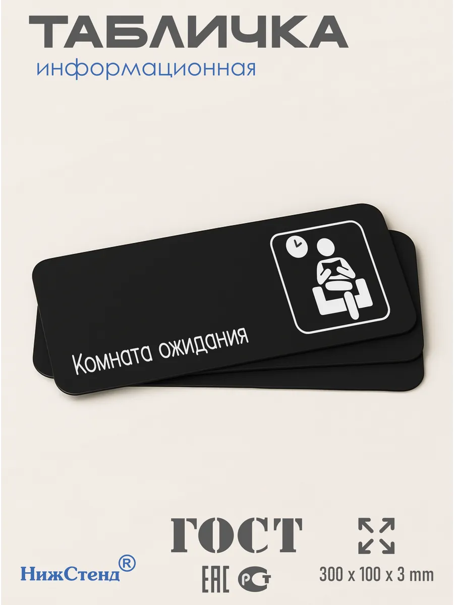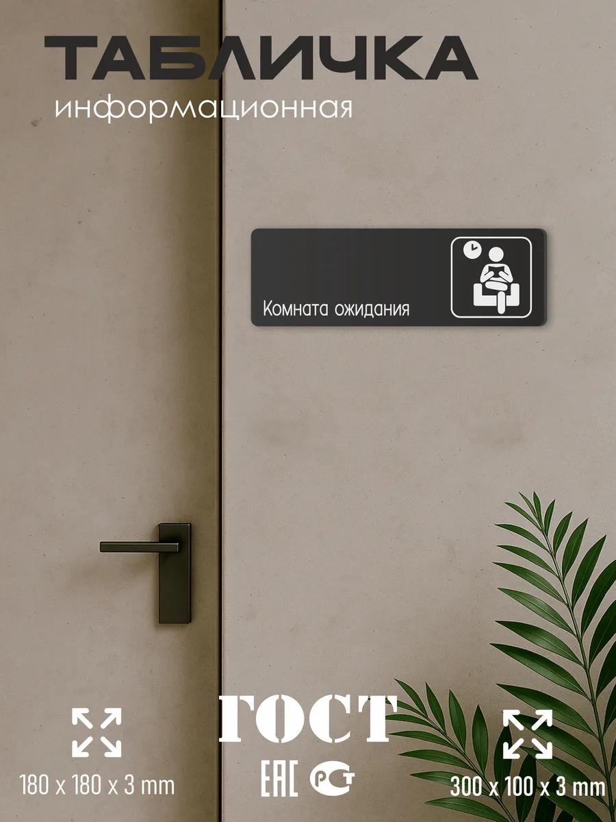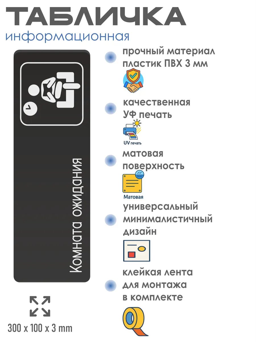 Табличка Комната ожидания интерьерная из черного ПВХ 3мм размером 30х10 см – это стильный и универсальный декоративный элемент, который поможет создать особую атмосферу в вашем интерьере. Изготовлена из высококачественного черного ПВХ, она обладает прочностью и долговечностью, что делает ее идеальным выбором для использования в различных помещениях. На табличке имеется возможность нанесения различных надписей, все представлены в ассортименте. Благодаря черному цвету и минималистичному дизайну, она легко сочетается с любым интерьером и стилем оформления. Эта табличка является универсальным решением для множества задач. Вы можете использовать ее для обозначения названий комнат, оповещения и предупреждения граждан. Она идеально подходит для дома, офиса, ресторана, гостиницы, в школу, в гос. учреждения, в клинику, в больницу, в фитнес клуб. В магазине представлены таблички с надписями: мужской туалет, женский туалет, офис, склад, место для курения, для персонала, курение запрещено, чистые бахилы, грязные бахилы, надевайте бахилы, женская раздевалка, мужская раздевалка, банкомат, бассейн, администрация, офис, буфет, камера хранения, прачечная, выключайте звуки телефона, туалет, комната матери и ребенка, вход, выход, генеральный директор, касса, информация, комната ожидания, не бросайте в унитаз туалетную бумагу и предметы гигиены, камера хранения, за оставленные вещи администрация ответственности не несет, ведется видеонаблюдение, выключайте звуки мобильного телефона