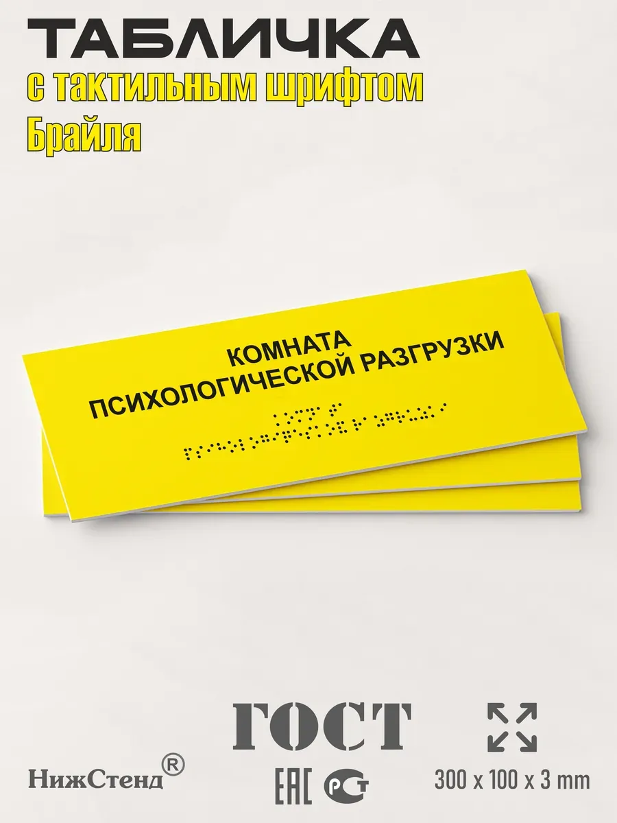 Тактильные таблички Брайля помогают незрячим и слабовидящим людям ориентироваться в пространстве. Система Брайля это тактильная система письма, используемая людьми с нарушениями зрения. Таблички со шрифтом Брайля представлены в нескольких вариантах: пиктограммы: информационные, предупреждающие, запрещающие знаки, символы доступности, всевозможные указатели и номера, помогающие ориентироваться в пространстве; вывески: название организации, режим работы и другие данные, надпись на обычном алфавите обычно дублируется шрифтом Брайля; кабинетные таблички: например, если речь идет о кабинетах врачей, обычно содержит номер и название должности, имя врача; мнемосхемы, вывески: необходимы для помощи при ориентации в пространстве — такие схемы имеют подробный план помещения, указания на запасные выходы, эвакуационные пути. Табличка шрифтом Брайля состоит из двух частей: зона восприятия пиктограммы/текста слабовидящими и зрячими людьми; зона восприятия пиктограммы/текста незрячими людьми — надпись на Брайле. При этом надпись или картинка, сделанные обычным шрифтом, рельефные — это позволит «прочесть» текст незрячему или слабовидящему человеку, который не владеет азбукой Брайлем. У нас в магазине представлен большой выбор тактильных табличек Брайля, которые Вы можете у нас купить. У нас есть вывески для любых кабинетов и помещений, с надписями или просто указатели. Если у Вас остались вопросы, задайте нам их и мы обязательно Вам ответим! Будем признательны за оставленный отзыв на наш товар! С уважением и наилучшими пожеланиями, магазин НижСтенд.