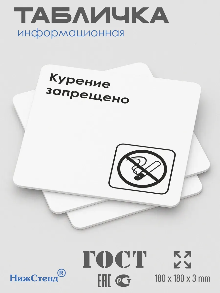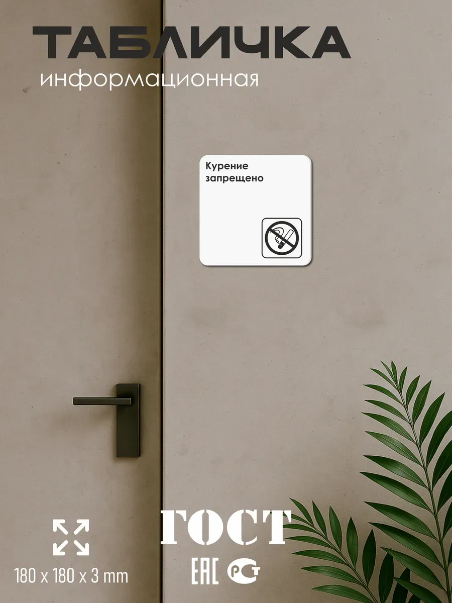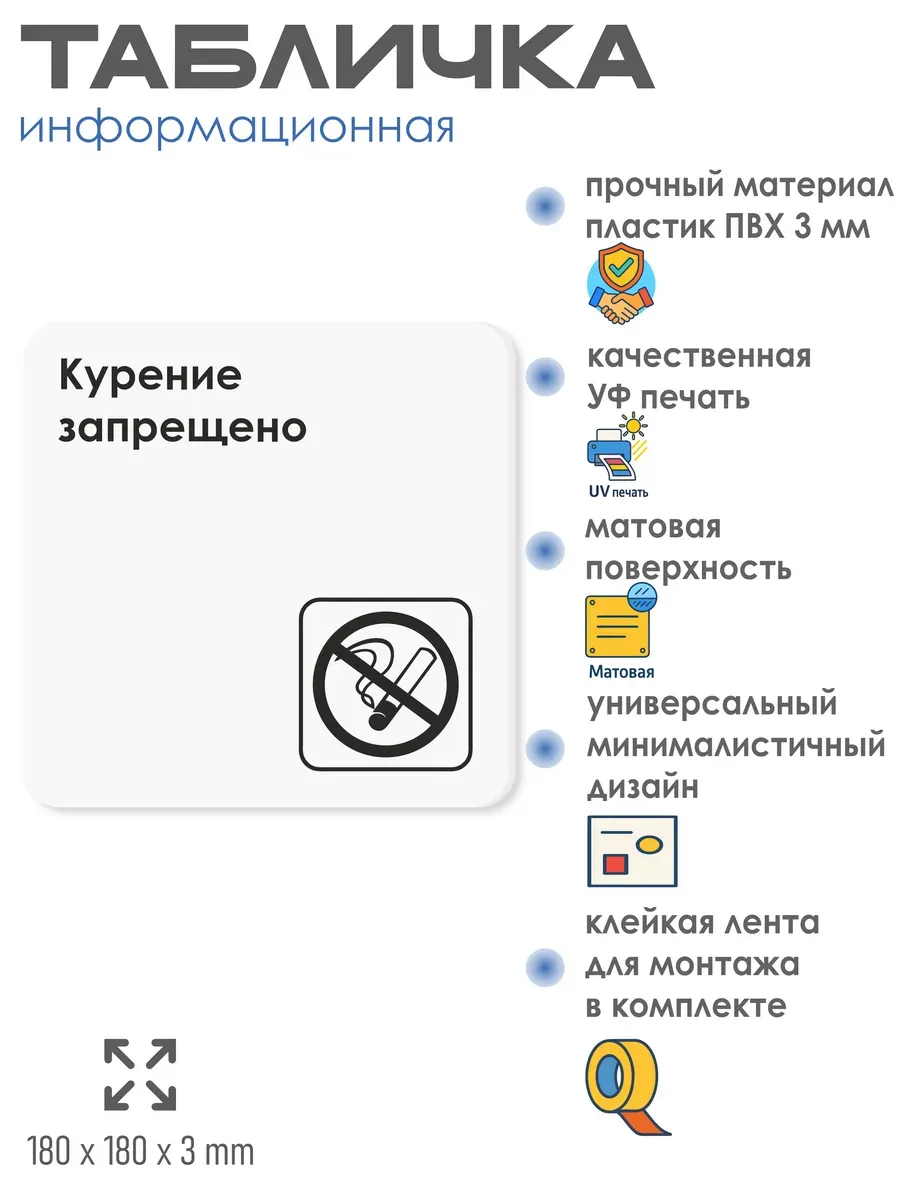 Табличка Курение запрещено с двусторонней клейкой лентой для монтажа в комплекте интерьерная из ПВХ 3мм размером 18х18 см – это стильный и универсальный декоративный элемент, который поможет создать особую атмосферу в вашем интерьере. Изготовлена из высококачественного ПВХ, она обладает прочностью и долговечностью, что делает ее идеальным выбором для использования в различных помещениях. На табличке имеется возможность нанесения различных надписей, все представлены в ассортименте. Благодаря белому цвету и минималистичному дизайну, она легко сочетается с любым интерьером и стилем оформления. Эта табличка является универсальным решением для множества задач. Вы можете использовать ее для обозначения названий комнат, оповещения и предупреждения граждан. Она идеально подходит для дома, офиса, ресторана, гостиницы, в школу, в гос. учреждения, в клинику, в больницу, в фитнес клуб. В магазине представлены таблички с надписями: мужской туалет, женский туалет, офис, склад, место для курения, для персонала, курение запрещено, чистые бахилы, грязные бахилы, надевайте бахилы, женская раздевалка, мужская раздевалка, банкомат, бассейн, администрация, офис, буфет, камера хранения, прачечная, выключайте звуки телефона, туалет, комната матери и ребенка, вход, выход, генеральный директор, касса, информация, комната ожидания, не бросайте в унитаз туалетную бумагу и предметы гигиены, камера хранения, за оставленные вещи администрация ответственности не несет, ведется видеонаблюдение, выключайте звуки мобильного телефона