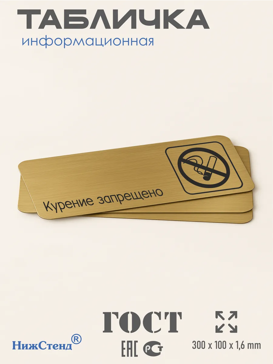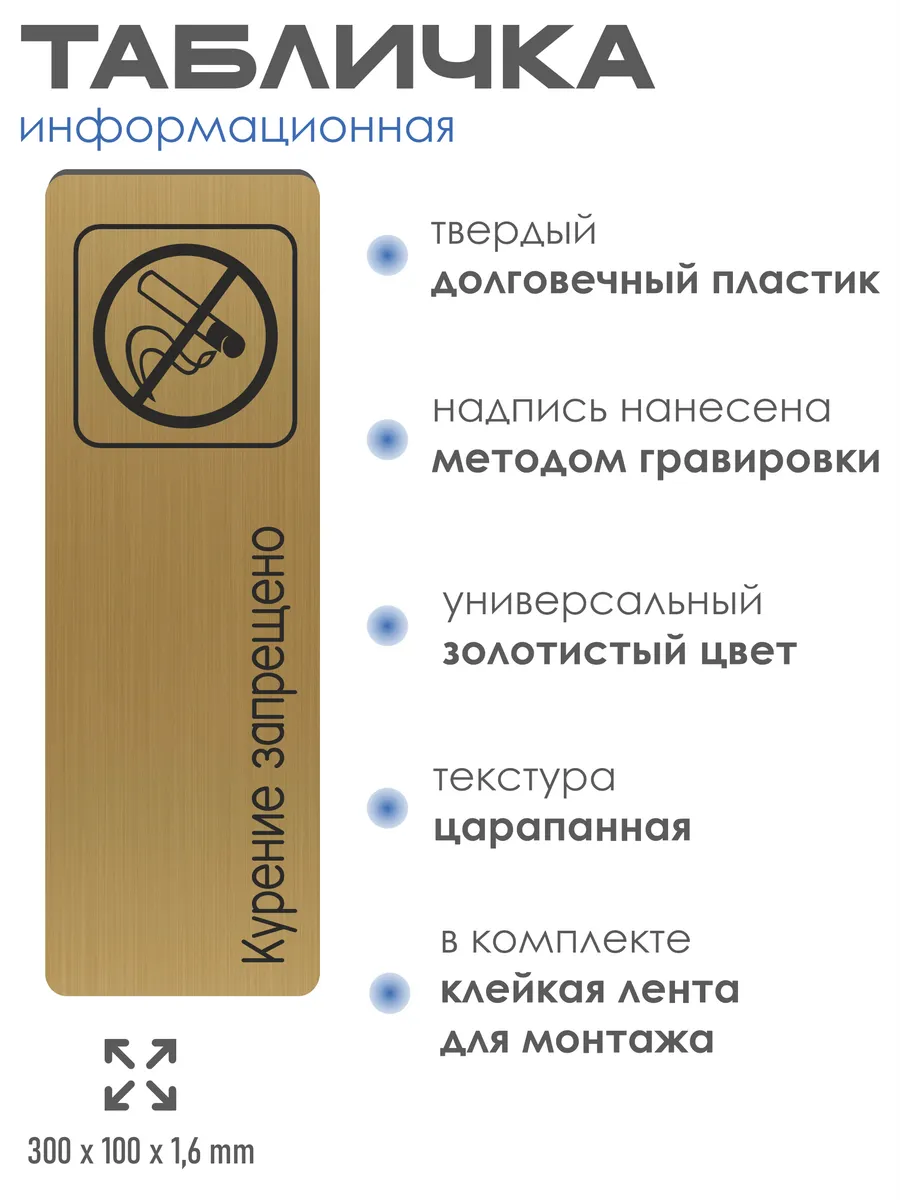 Табличка Курение запрещено из золотистого пластика с царапанной текстурой размером 30х10 см. На обратной стороне таблички – двусторонняя клейкая лента для монтажа таблички без сверления. Текст и пиктограмма на табличку наносятся методом гравировки, такм образом изображение на табличке не будет сдираться, а также устойчиво к выгоранию и механическим повреждениям. При необходимости табличку можно протирать влажной тряпкой или салфетками. Табличка с гравировкой с надписью Курение запрещено имеет сертификат ГОСТ и изготовлена из материалов не поддерживающих горение