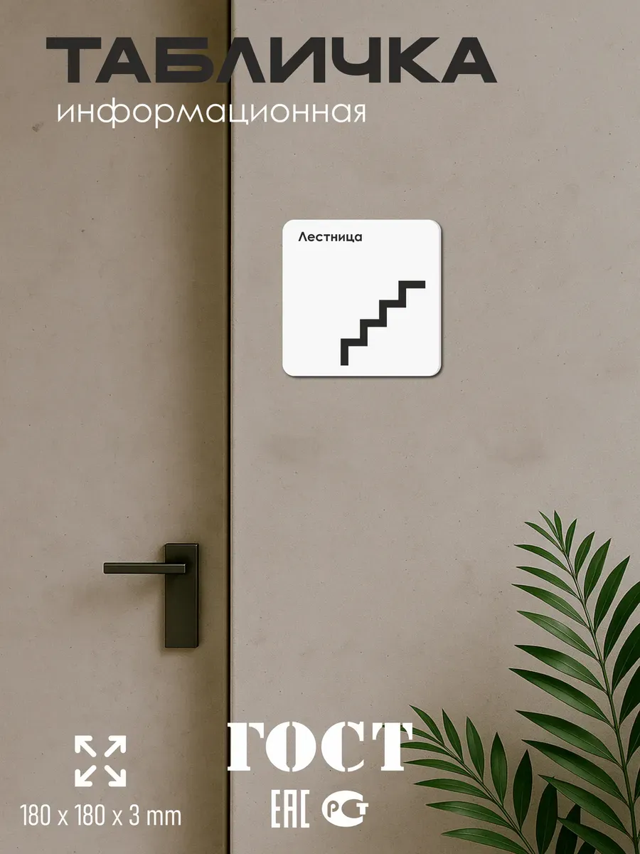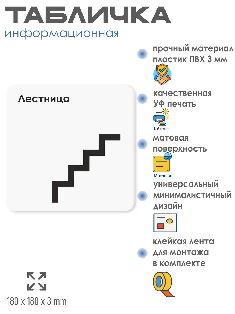 Табличка Лестница направление движения стрелка с двусторонней клейкой лентой для монтажа в комплекте директор интерьерная из ПВХ 3мм размером 18х18 см – это стильный и универсальный декоративный элемент, который поможет создать особую атмосферу в вашем интерьере. Изготовлена из высококачественного ПВХ, она обладает прочностью и долговечностью, что делает ее идеальным выбором для использования в различных помещениях. На табличке имеется возможность нанесения различных надписей, все представлены в ассортименте. Благодаря белому цвету и минималистичному дизайну, она легко сочетается с любым интерьером и стилем оформления. Эта табличка является универсальным решением для множества задач. Вы можете использовать ее для обозначения названий комнат, оповещения и предупреждения граждан. Она идеально подходит для дома, офиса, ресторана, гостиницы, в школу, в гос. учреждения, в клинику, в больницу, в фитнес клуб. В магазине представлены таблички с надписями: мужской туалет, женский туалет, офис, склад, место для курения, для персонала, курение запрещено, чистые бахилы, грязные бахилы, надевайте бахилы, женская раздевалка, мужская раздевалка, банкомат, бассейн, администрация, офис, буфет, камера хранения, прачечная, выключайте звуки телефона, туалет, комната матери и ребенка, вход, выход, генеральный директор, касса, информация, комната ожидания, не бросайте в унитаз туалетную бумагу и предметы гигиены, камера хранения, за оставленные вещи администрация ответственности не несет, ведется видеонаблюдение, выключайте звуки мобильного телефона