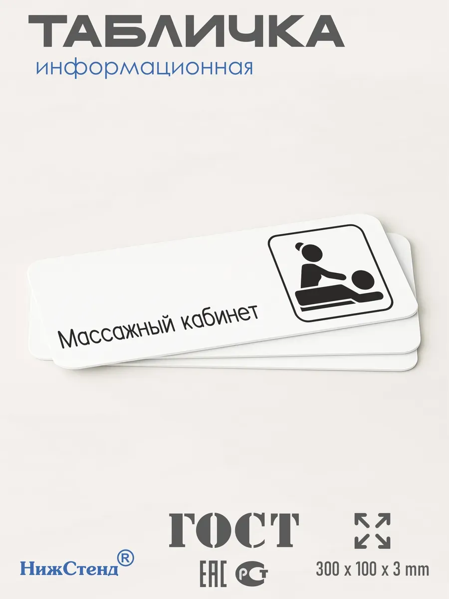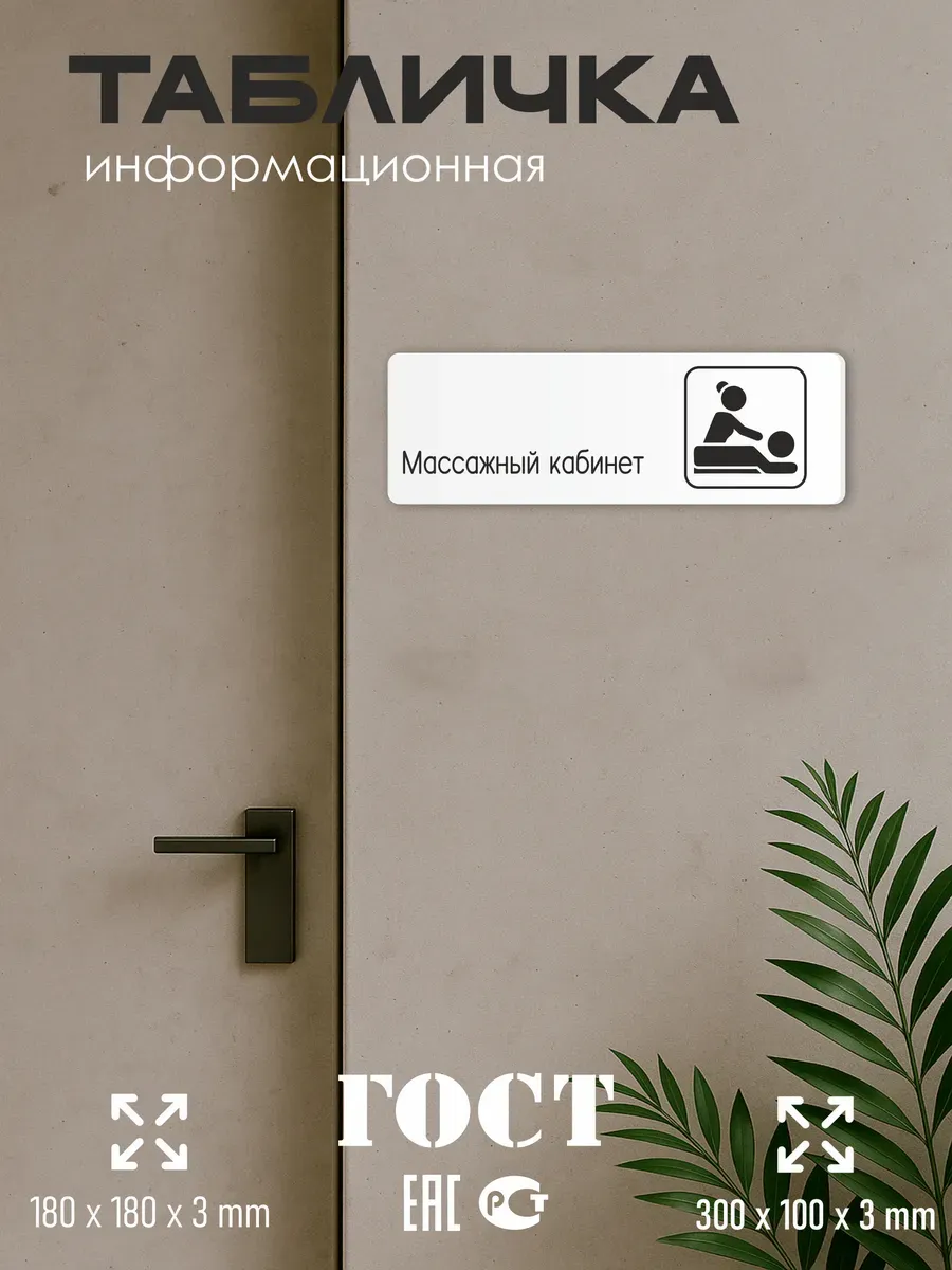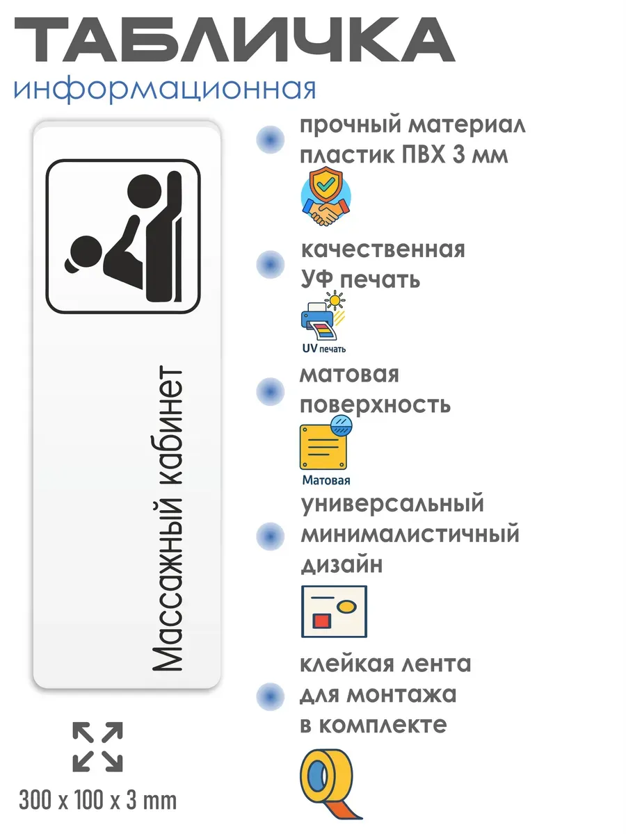 Табличка Массажный кабинет с двусторонней клейкой лентой для монтажа в комплекте интерьерная из ПВХ 3мм размером 30х10 см – это стильный и универсальный декоративный элемент, который поможет создать особую атмосферу в вашем интерьере. Изготовлена из высококачественного ПВХ, она обладает прочностью и долговечностью, что делает ее идеальным выбором для использования в различных помещениях. На табличке имеется возможность нанесения различных надписей, все представлены в ассортименте. Благодаря белому цвету и минималистичному дизайну, она легко сочетается с любым интерьером и стилем оформления. Эта табличка является универсальным решением для множества задач. Вы можете использовать ее для обозначения названий комнат, оповещения и предупреждения граждан. Она идеально подходит для дома, офиса, ресторана, гостиницы, в школу, в гос. учреждения, в клинику, в больницу, в фитнес клуб. В магазине представлены таблички с надписями: мужской туалет, женский туалет, офис, склад, место для курения, для персонала, курение запрещено, чистые бахилы, грязные бахилы, надевайте бахилы, женская раздевалка, мужская раздевалка, банкомат, бассейн, администрация, офис, буфет, камера хранения, прачечная, выключайте звуки телефона, туалет, комната матери и ребенка, вход, выход, генеральный директор, касса, информация, комната ожидания, не бросайте в унитаз туалетную бумагу и предметы гигиены, камера хранения, за оставленные вещи администрация ответственности не несет, ведется видеонаблюдение, выключайте звуки мобильного телефона