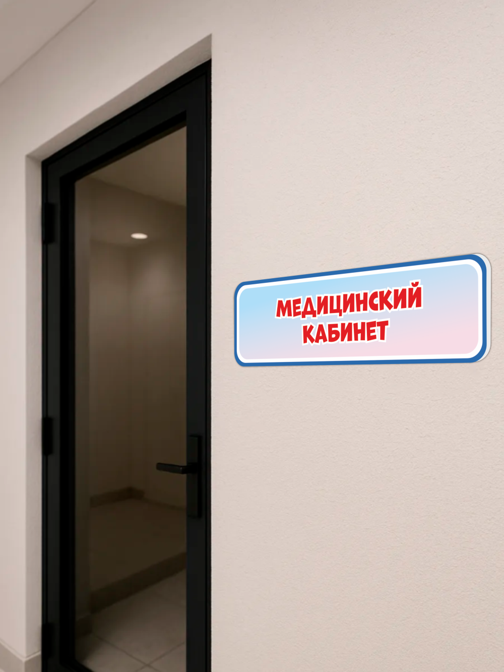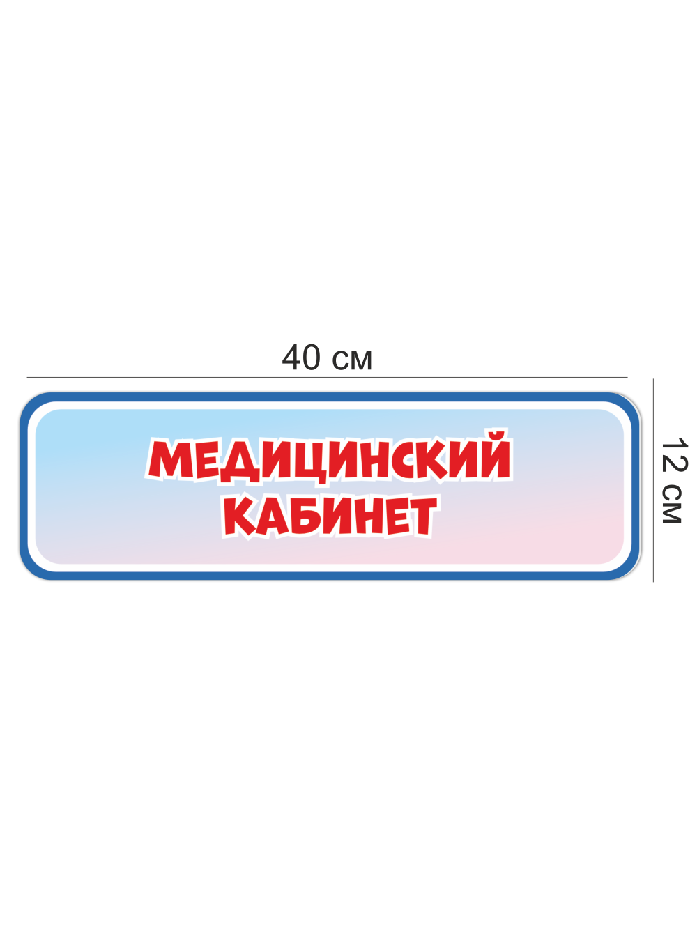 Табличка «Медицинский кабинет» предназначена для обозначения кабинетов медицинского персонала в детских садах, школах, учреждениях образования, санаториях, офисах и предприятиях. Изготовлена из прочного ПВХ толщиной 3 мм, размер изделия — 40×12 см.
