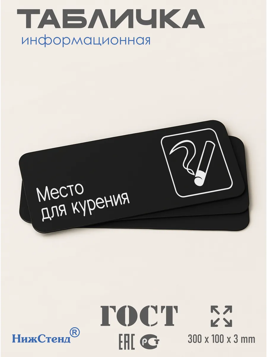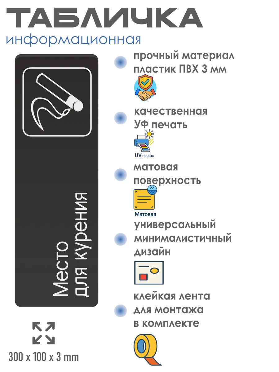 Табличка Место для курения интерьерная из черного ПВХ 3мм размером 30х10 см – это стильный и универсальный декоративный элемент, который поможет создать особую атмосферу в вашем интерьере. Изготовлена из высококачественного черного ПВХ, она обладает прочностью и долговечностью, что делает ее идеальным выбором для использования в различных помещениях. На табличке имеется возможность нанесения различных надписей, все представлены в ассортименте. Благодаря черному цвету и минималистичному дизайну, она легко сочетается с любым интерьером и стилем оформления. Эта табличка является универсальным решением для множества задач. Вы можете использовать ее для обозначения названий комнат, оповещения и предупреждения граждан. Она идеально подходит для дома, офиса, ресторана, гостиницы, в школу, в гос. учреждения, в клинику, в больницу, в фитнес клуб. В магазине представлены таблички с надписями: мужской туалет, женский туалет, офис, склад, место для курения, для персонала, курение запрещено, чистые бахилы, грязные бахилы, надевайте бахилы, женская раздевалка, мужская раздевалка, банкомат, бассейн, администрация, офис, буфет, камера хранения, прачечная, выключайте звуки телефона, туалет, комната матери и ребенка, вход, выход, генеральный директор, касса, информация, комната ожидания, не бросайте в унитаз туалетную бумагу и предметы гигиены, камера хранения, за оставленные вещи администрация ответственности не несет, ведется видеонаблюдение, выключайте звуки мобильного телефона