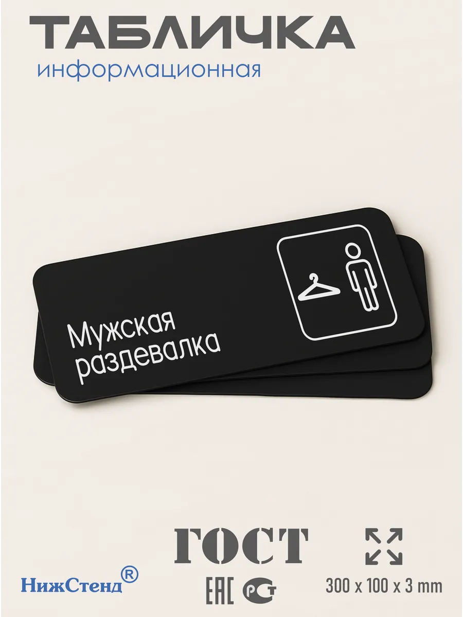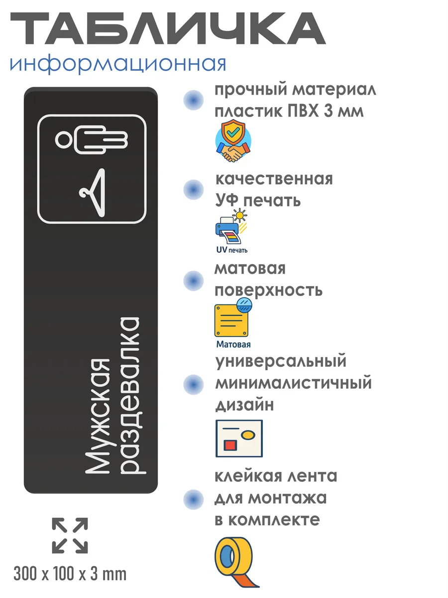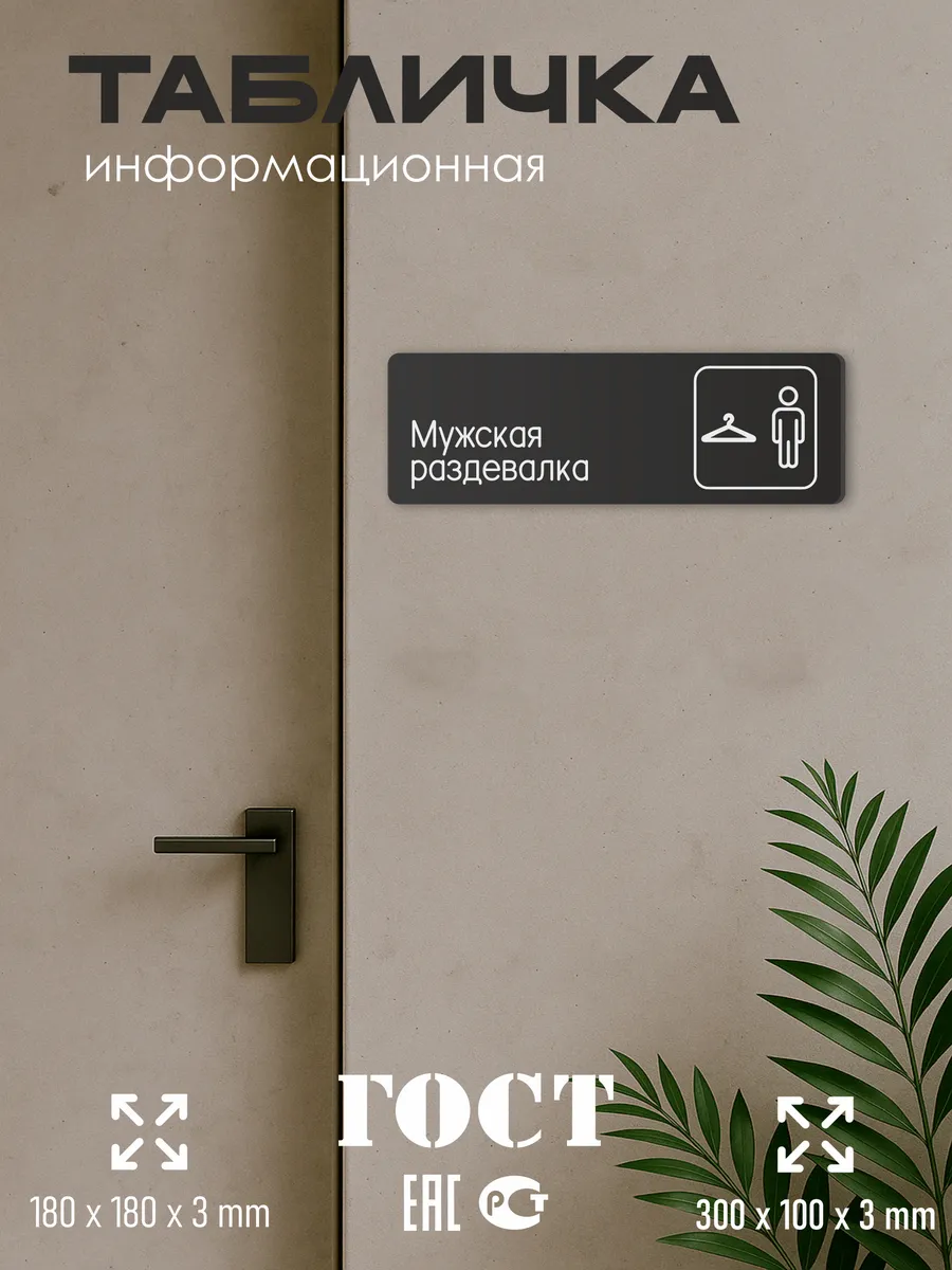 Табличка Мужская раздевалка интерьерная из черного ПВХ 3мм размером 30х10 см – это стильный и универсальный декоративный элемент, который поможет создать особую атмосферу в вашем интерьере. Изготовлена из высококачественного черного ПВХ, она обладает прочностью и долговечностью, что делает ее идеальным выбором для использования в различных помещениях. На табличке имеется возможность нанесения различных надписей, все представлены в ассортименте. Благодаря черному цвету и минималистичному дизайну, она легко сочетается с любым интерьером и стилем оформления. Эта табличка является универсальным решением для множества задач. Вы можете использовать ее для обозначения названий комнат, оповещения и предупреждения граждан. Она идеально подходит для дома, офиса, ресторана, гостиницы, в школу, в гос. учреждения, в клинику, в больницу, в фитнес клуб. В магазине представлены таблички с надписями: мужской туалет, женский туалет, офис, склад, место для курения, для персонала, курение запрещено, чистые бахилы, грязные бахилы, надевайте бахилы, женская раздевалка, мужская раздевалка, банкомат, бассейн, администрация, офис, буфет, камера хранения, прачечная, выключайте звуки телефона, туалет, комната матери и ребенка, вход, выход, генеральный директор, касса, информация, комната ожидания, не бросайте в унитаз туалетную бумагу и предметы гигиены, камера хранения, за оставленные вещи администрация ответственности не несет, ведется видеонаблюдение, выключайте звуки мобильного телефона