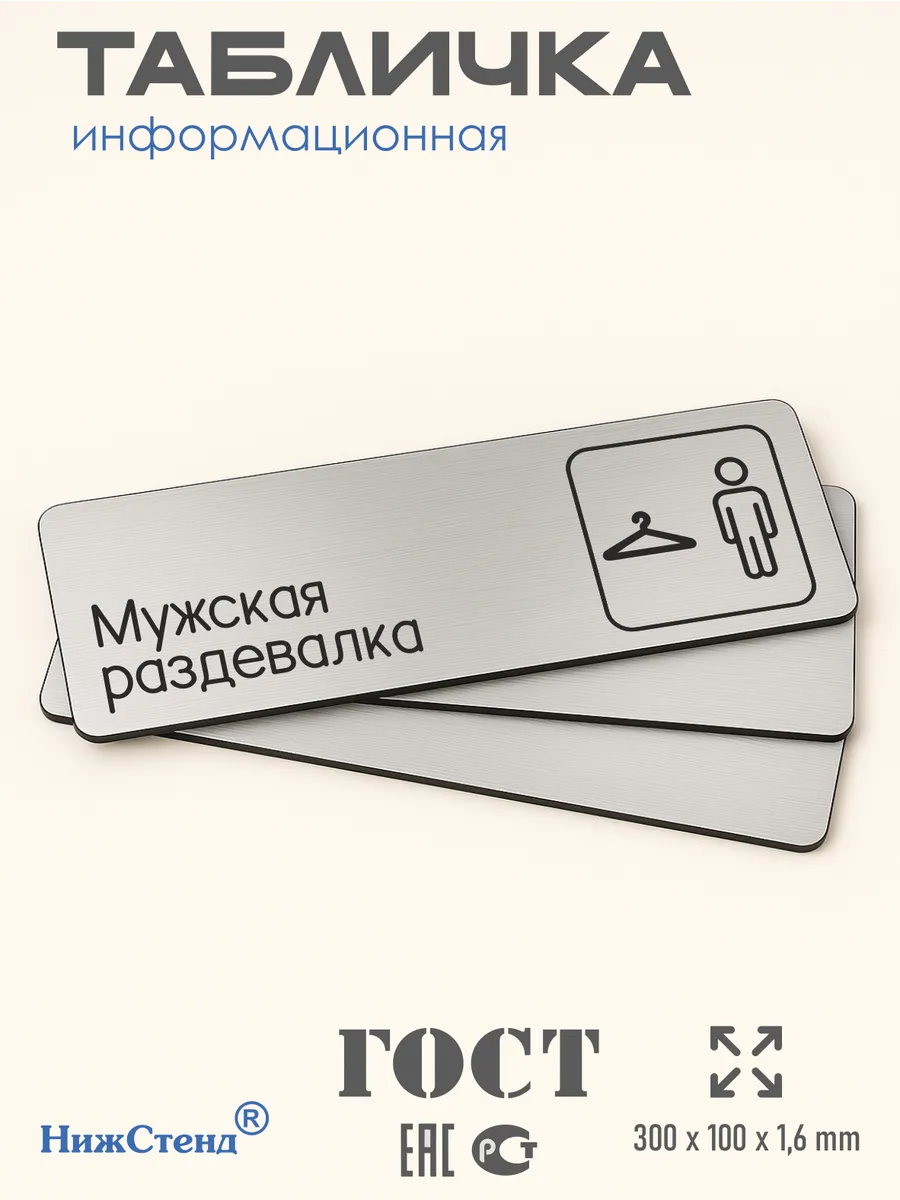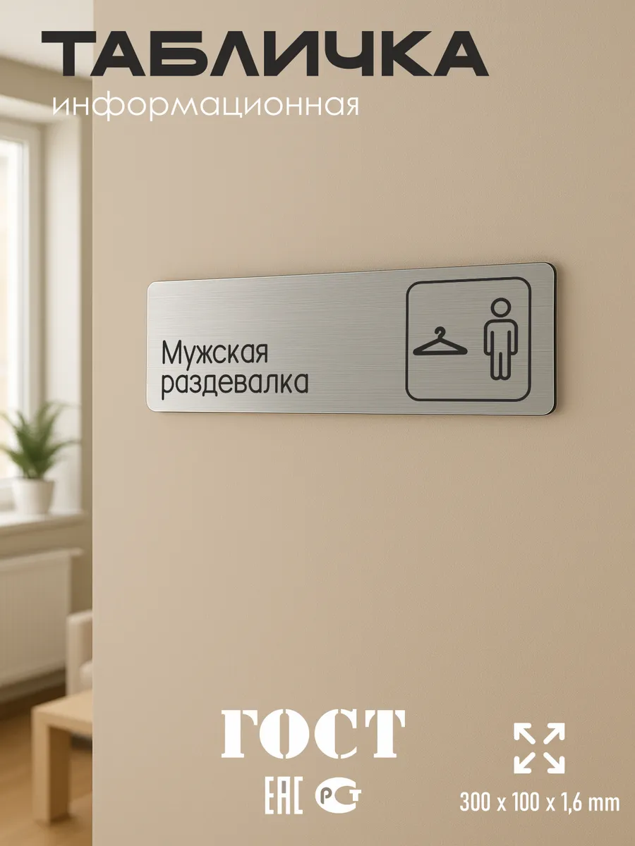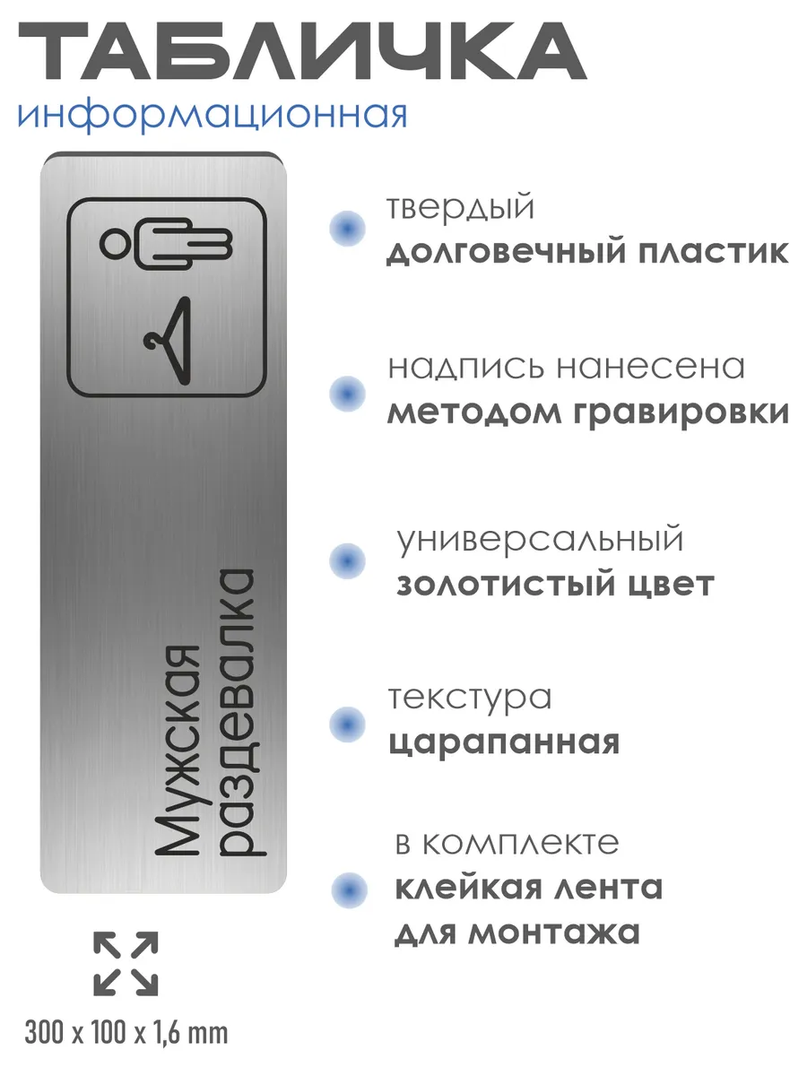 Табличка Мужская раздевалка из серебристого пластика с царапанной текстурой размером 30х10 см. На обратной стороне таблички – двусторонняя клейкая лента для монтажа таблички без сверления. Текст и пиктограмма на табличку наносятся методом гравировки, такм образом изображение на табличке не будет сдираться, а также устойчиво к выгоранию и механическим повреждениям. При необходимости табличку можно протирать влажной тряпкой или салфетками. Табличка с гравировкой с надписью Мужская раздевалка имеет сертификат ГОСТ и изготовлена из материалов не поддерживающих горение