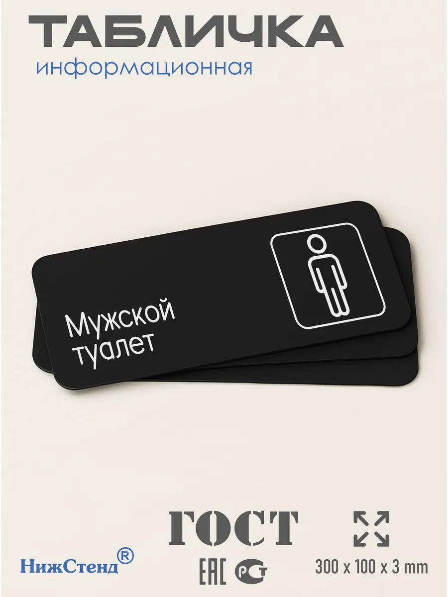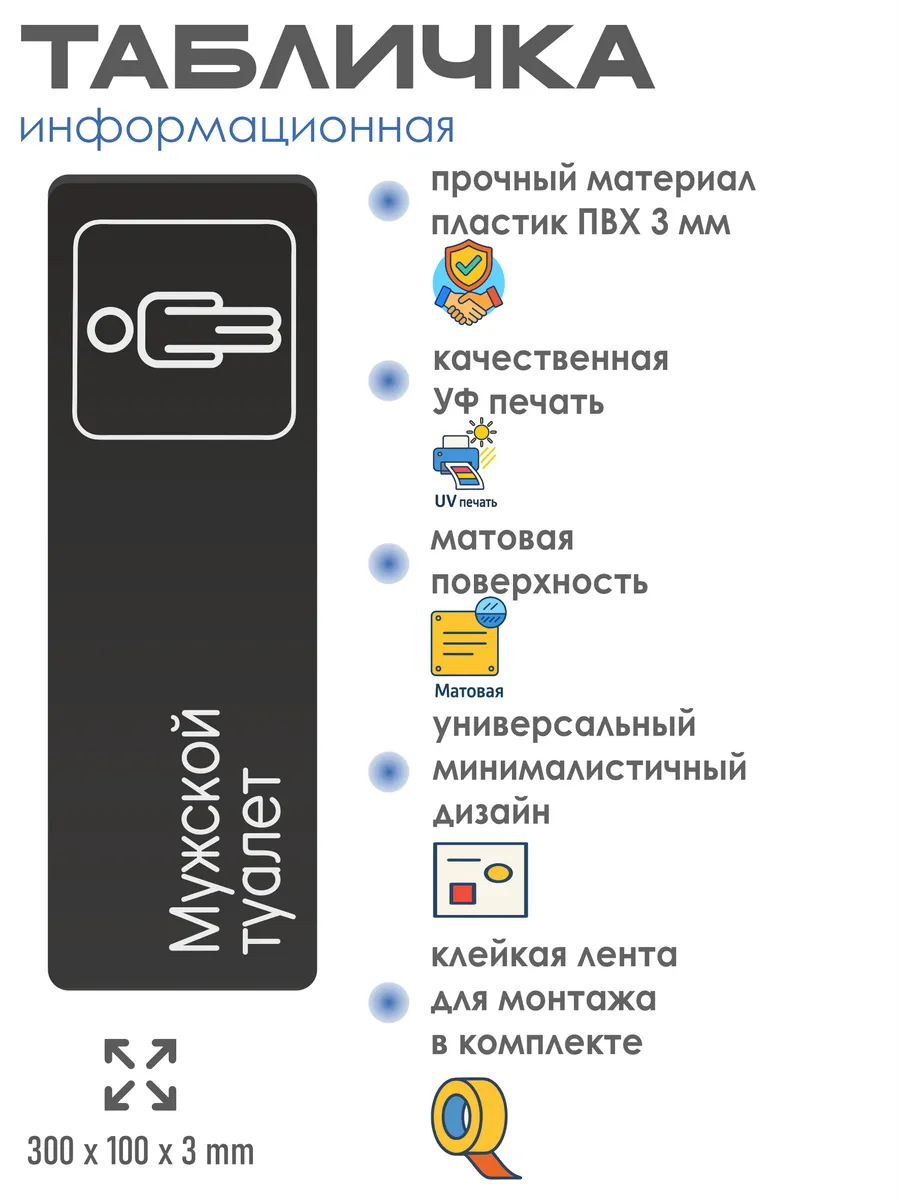 Табличка Мужской туалет интерьерная из черного ПВХ 3мм размером 30х10 см – это стильный и универсальный декоративный элемент, который поможет создать особую атмосферу в вашем интерьере. Изготовлена из высококачественного черного ПВХ, она обладает прочностью и долговечностью, что делает ее идеальным выбором для использования в различных помещениях. На табличке имеется возможность нанесения различных надписей, все представлены в ассортименте. Благодаря черному цвету и минималистичному дизайну, она легко сочетается с любым интерьером и стилем оформления. Эта табличка является универсальным решением для множества задач. Вы можете использовать ее для обозначения названий комнат, оповещения и предупреждения граждан. Она идеально подходит для дома, офиса, ресторана, гостиницы, в школу, в гос. учреждения, в клинику, в больницу, в фитнес клуб. В магазине представлены таблички с надписями: мужской туалет, женский туалет, офис, склад, место для курения, для персонала, курение запрещено, чистые бахилы, грязные бахилы, надевайте бахилы, женская раздевалка, мужская раздевалка, банкомат, бассейн, администрация, офис, буфет, камера хранения, прачечная, выключайте звуки телефона, туалет, комната матери и ребенка, вход, выход, генеральный директор, касса, информация, комната ожидания, не бросайте в унитаз туалетную бумагу и предметы гигиены, камера хранения, за оставленные вещи администрация ответственности не несет, ведется видеонаблюдение, выключайте звуки мобильного телефона