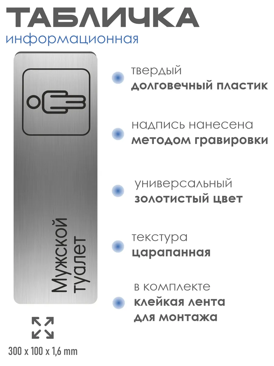 Табличка Мужской туалет из серебристого пластика с царапанной текстурой размером 30х10 см. На обратной стороне таблички – двусторонняя клейкая лента для монтажа таблички без сверления. Текст и пиктограмма на табличку наносятся методом гравировки, такм образом изображение на табличке не будет сдираться, а также устойчиво к выгоранию и механическим повреждениям. При необходимости табличку можно протирать влажной тряпкой или салфетками. Табличка с гравировкой с надписью Мужской туалет имеет сертификат ГОСТ и изготовлена из материалов не поддерживающих горение